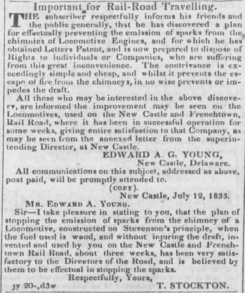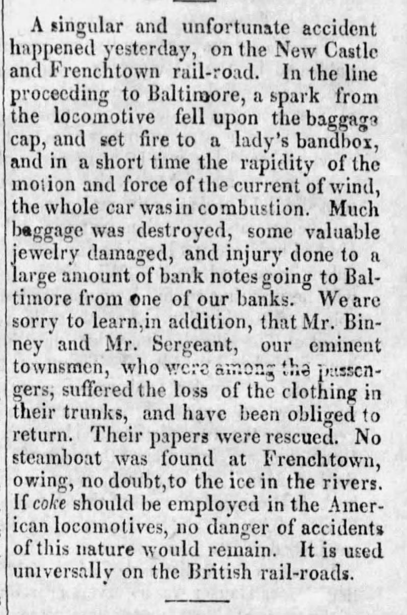 In 1835, Davy Crockett took his first-ever train ride aboard the New Castle & Frenchtown Railroad. He described it in his journal: Our passage down the Chesapeake Bay was very pleasant; and in a very short run we came to the place where we were to get on board of the railroad cars This was a clean new sight to me; about a dozen big stages hung on to one machine, and to start up hill After a good deal of fuss we all got seated, and moved slowly off; the engine wheezing as if she had the tizzick. By-and-by she began to take short breaths, and away we went with a blue streak after us. The whole distance is seventeen miles, and it was run in fifty-five minutes.