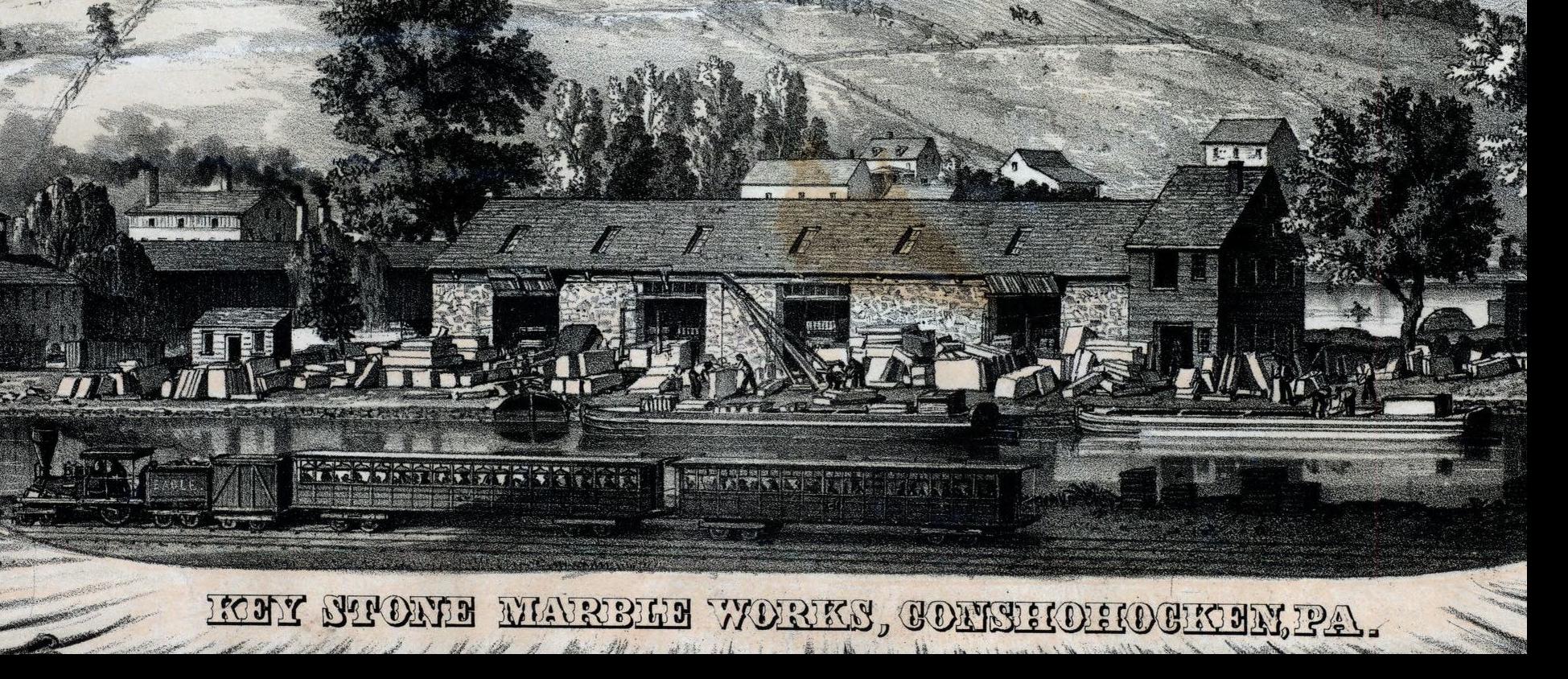 marble works in Pennsylvania are shown unloading canal boats while a steam passenger train passes by.