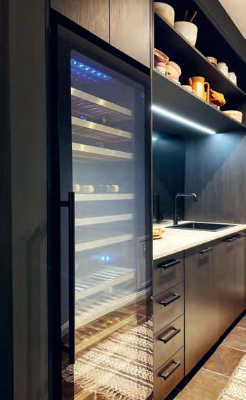 “The kitchenette has a much sleeker silhouette, using dark wenge grain cabinetry and a smoky mirror splashback. However, there remain references to the adjoining space, including the matt black handles featuring the same lineal grooves as the under-bench cupboards in the bar.”
