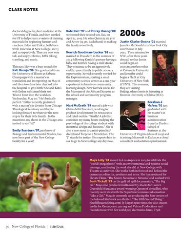 doctoral degree in plant medicine at the University of Florida, and then worked for UF to help create a variety of training materials for beginning farmers and ranchers. Edon and Ezikai, both born while Jesse was at New College, are 13 and 11 respectively. They are now very tall, and enjoy robotics, BMX biking, traveling, and music. This past May was a busy month for Kati Baruja ‘96! She graduated from the University of Illinois at UrbanaChampaign with a master’s in translation and interpreting on May 16 and then two days later checked into the hospital to give birth! She and Kati’s wife Esther welcomed their son Tekové Emet into the world on Wednesday, May 20: “He’s basically perfect.” Esther recently graduated with a master’s in divinity from Chicago Theological Seminary and they’re looking forward to whatever the next step is for their little family. In the meantime any alums in the Chicago area invited to say “hi!” Emily Saarinen ’97, professor of Biology and Environmental Studies, has now been part of the New College faculty for a year!