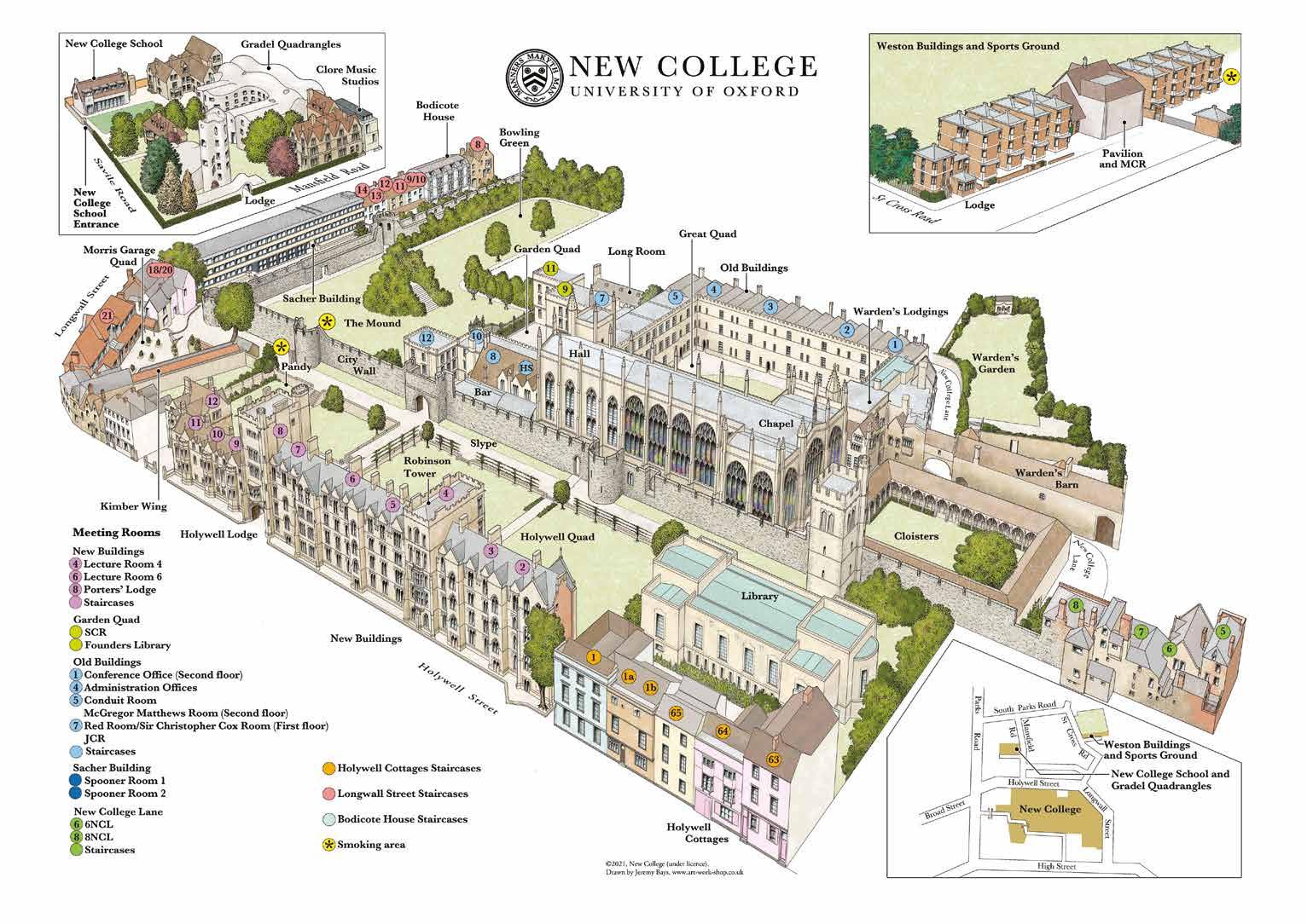 Returning undergraduates are housed in New Buildings, Old Buildings, Hall Stairs, the Holywell Cottages, New College Lane houses, Sacher Building, the Longwall Street houses, Bodicote House and the new Gradel Quadrangles. Plicense see the College map on page 4/5 for reference.