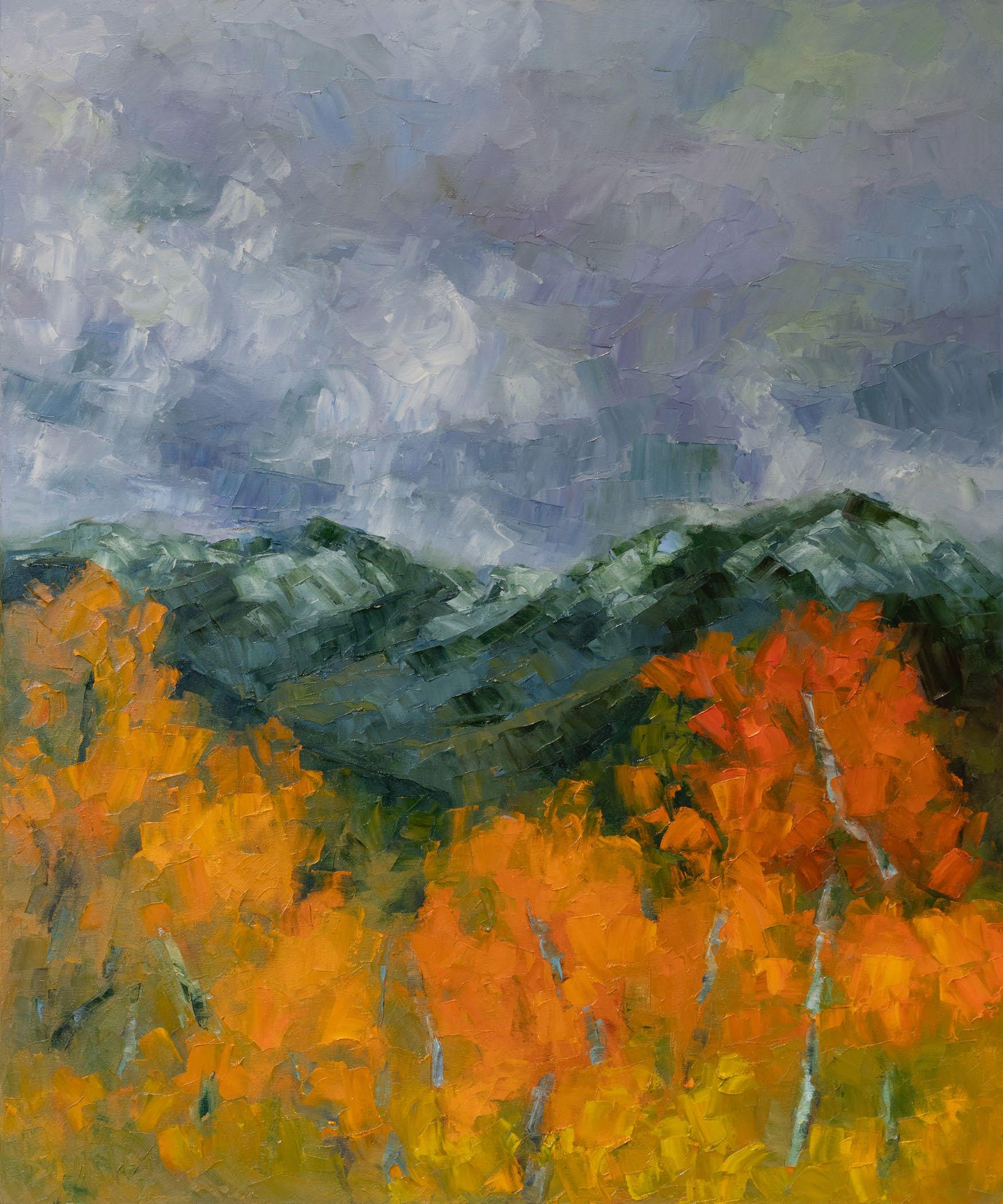 Binkley’s plein air paintings are intuitive and exhilarating translations of nature and the landscapes of New Mexico and southern Colorado. She is compelled to paint by the desire to capture the expression, movement and color of the landscape. Binkley uses a small canvas to quickly encapsulate a natural scene, and then, if she finds the plein air piece sufficiently compelling, she may choose to revisit the scene in a larger studio painting. The smaller works become the inspirational foundation for her large canvases: However, the larger pieces are also largely created from her memories, not just of the scene, but also of the full experience of creating the plein air painting.