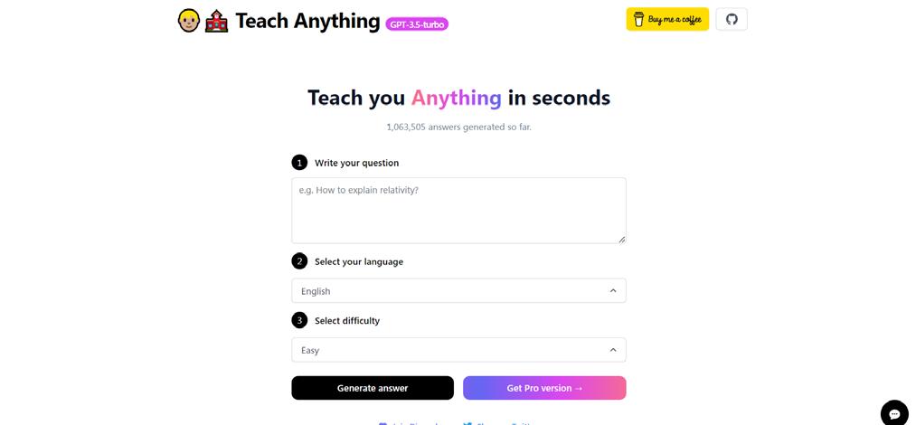 Teach-anything.com: Teach-anything.com is an AIbased tool utilising GPT-3.5-TURBO for generating any questions one may have (language and difficulty level can be set) and well, teach anything. It can be a valuable resource for educators looking to generate lessons.