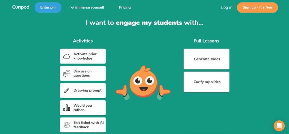 Curipod.com: Curipod.com is another tool educators can use for generating and delivering interactive lessons, from creating slides or uploading existing presentations to using word cloud, polls, illustrations, or open Q&A for student engagement.