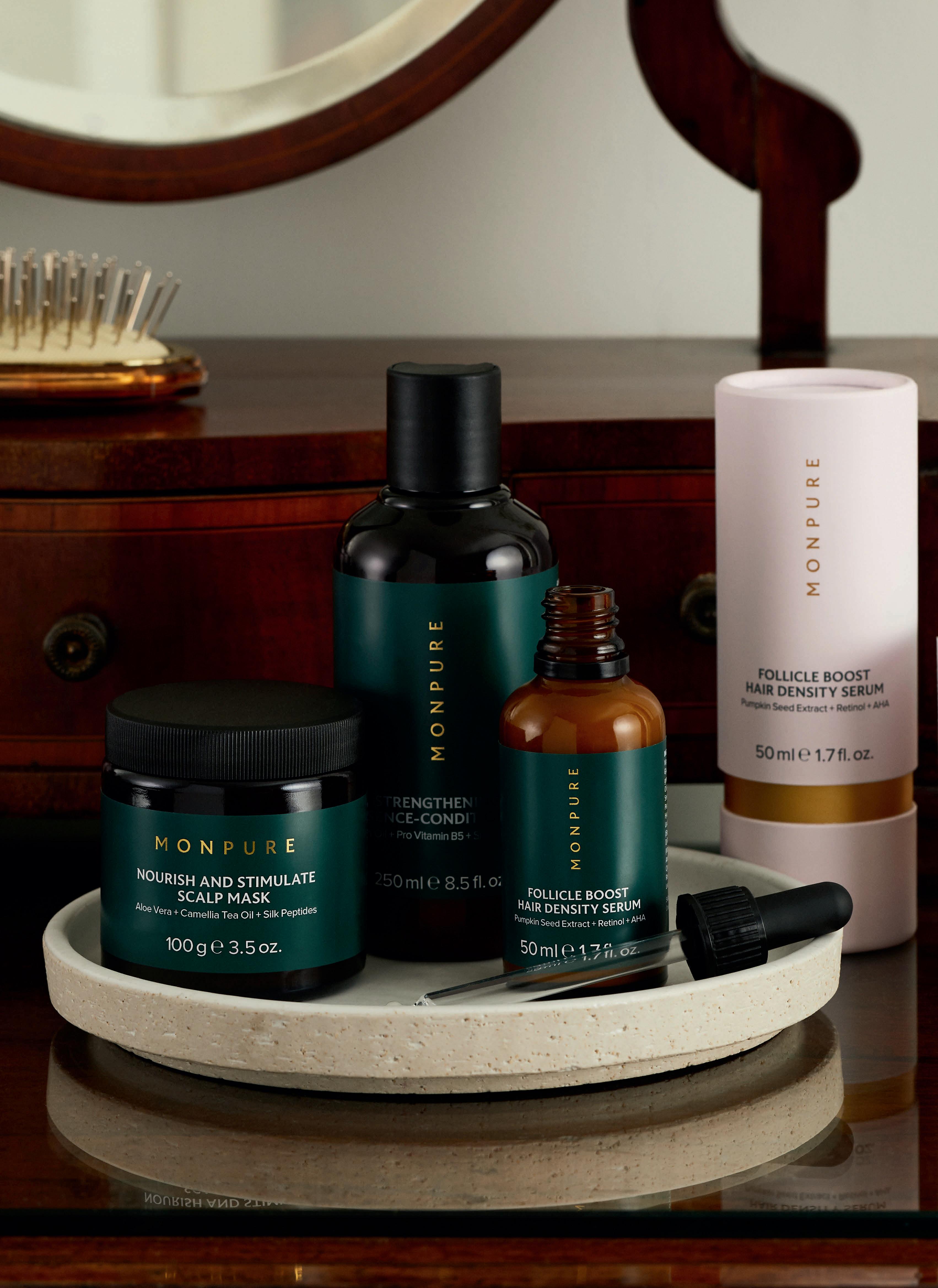Award-winning formulas, backed by research Monpure has channelled its research into products like the scientist-approved, award-winning Follicle Boost Hair Density Serum. This formula works to prolong productive anagen growth in the hair growth cycle, minimise telogen shedding, accelerate cell turnover, inhibit follicle sensitivity to the hormone DHT, and rebuild hair’s natural structural integrity.