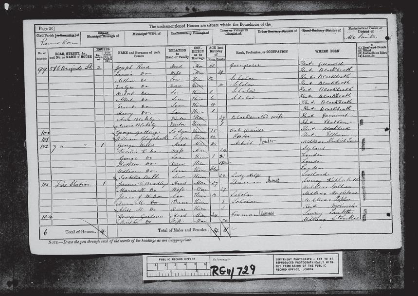 Top right A page from the 1881 census listing the residents of Brigade Street and the fire station
