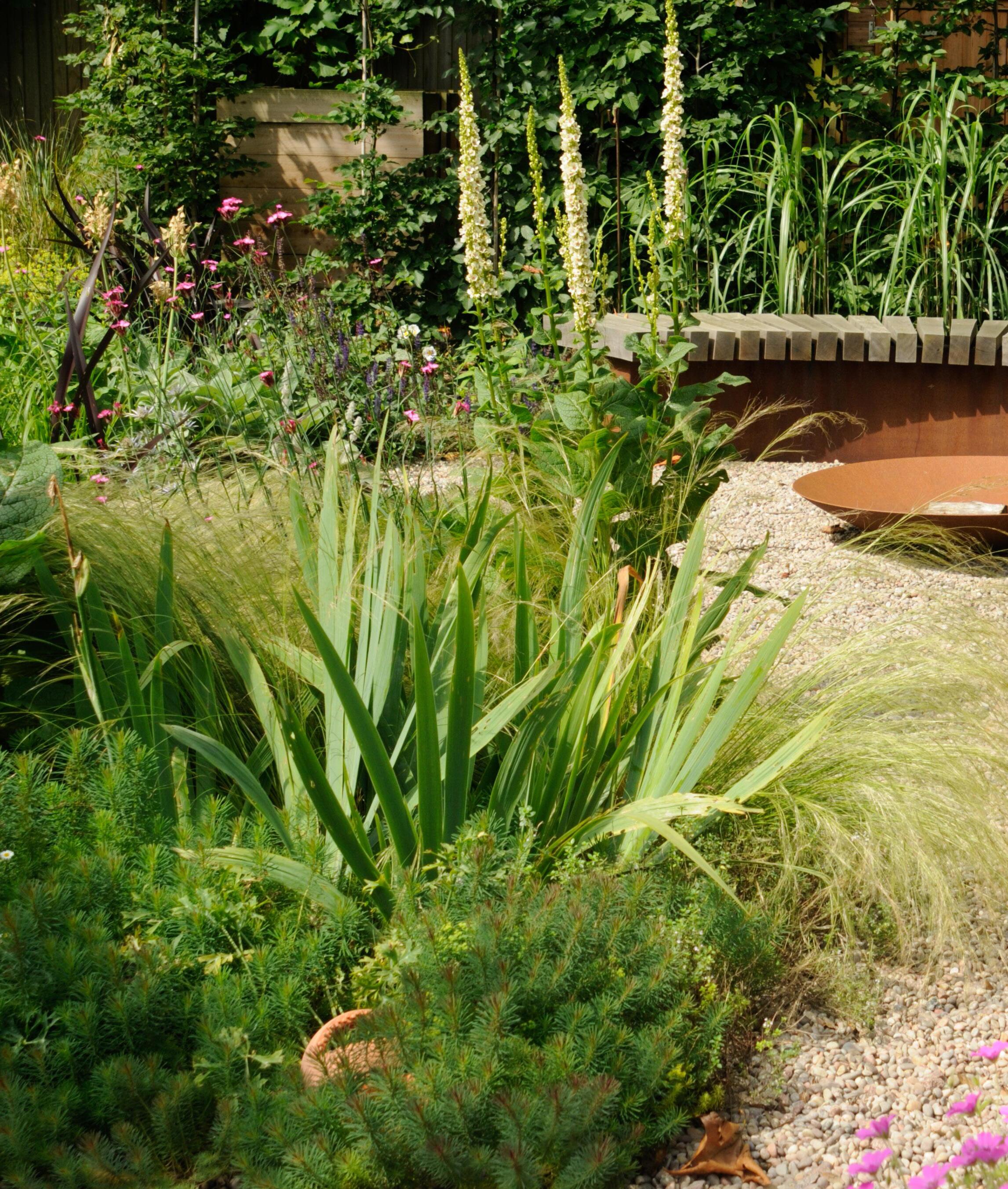 Edible plants such as herbs can be integrated and space to grow fruit and vegetables is no longer relegated to the rear of the garden. These are areas to be celebrated and enjoyed as part of the main space. Rainwater capture is key – water butts to store water and permeable terraces and paths to drain into the ground. Slowing the progress of water is helpful for our own plots but also for the wider landscape.