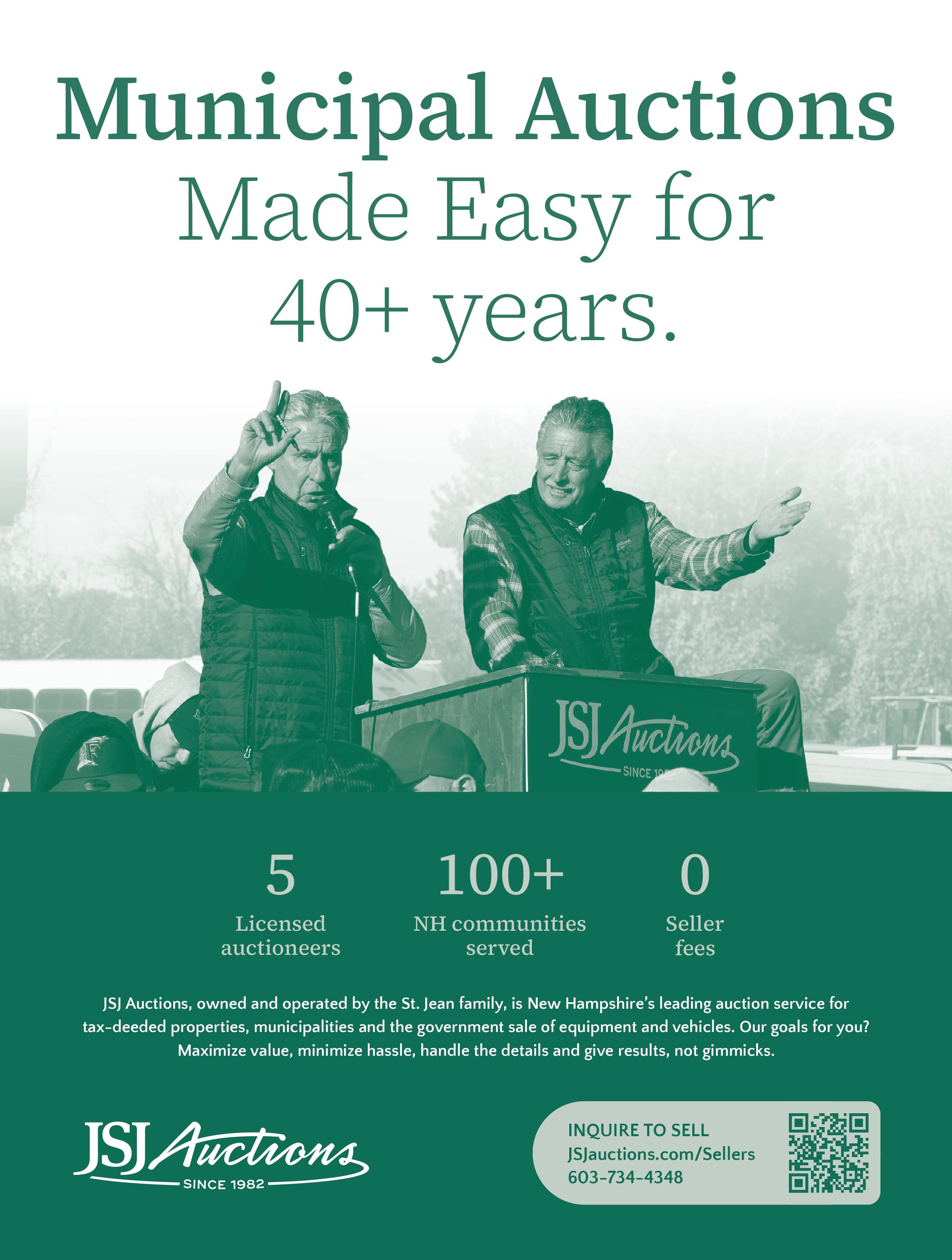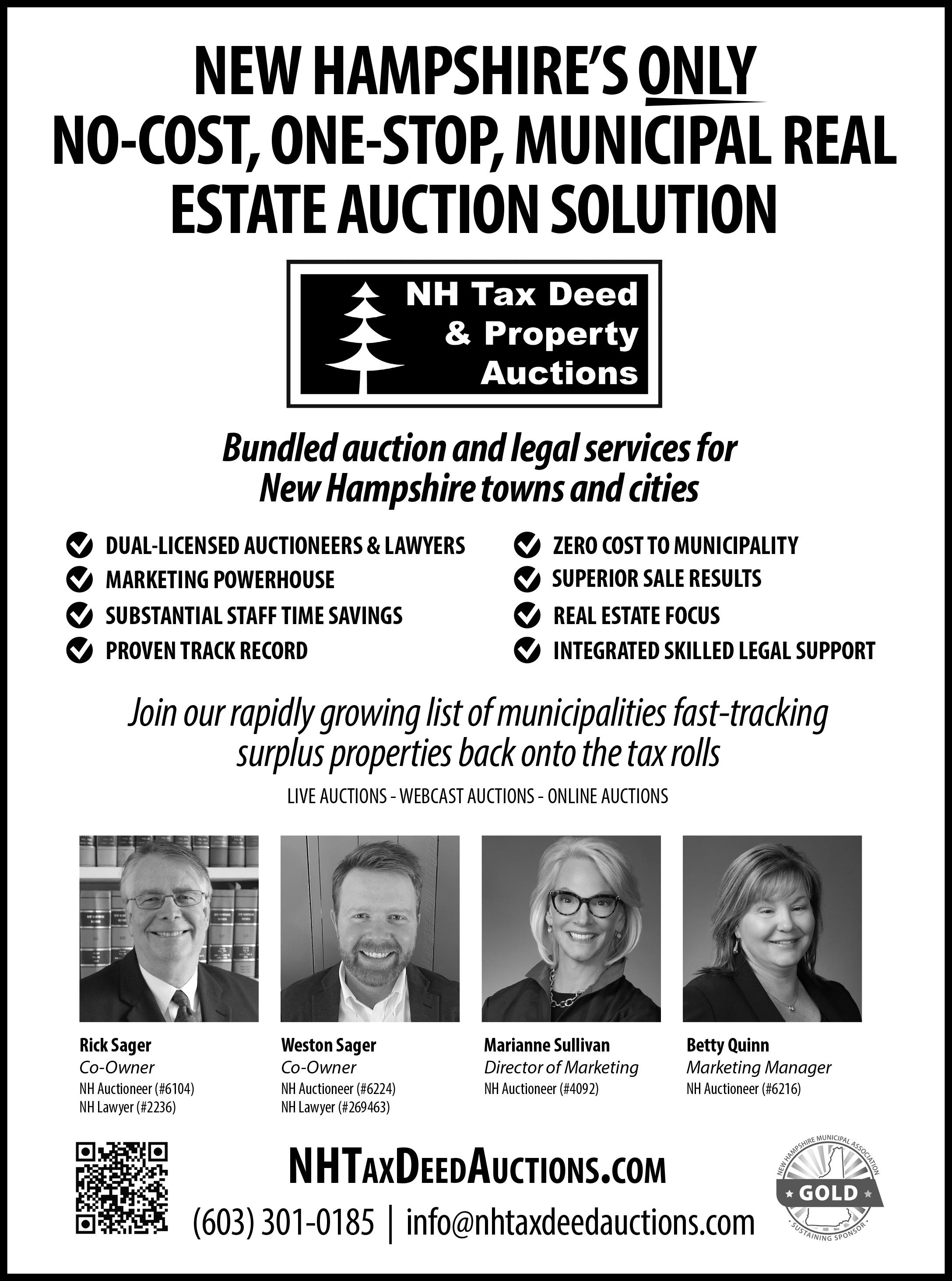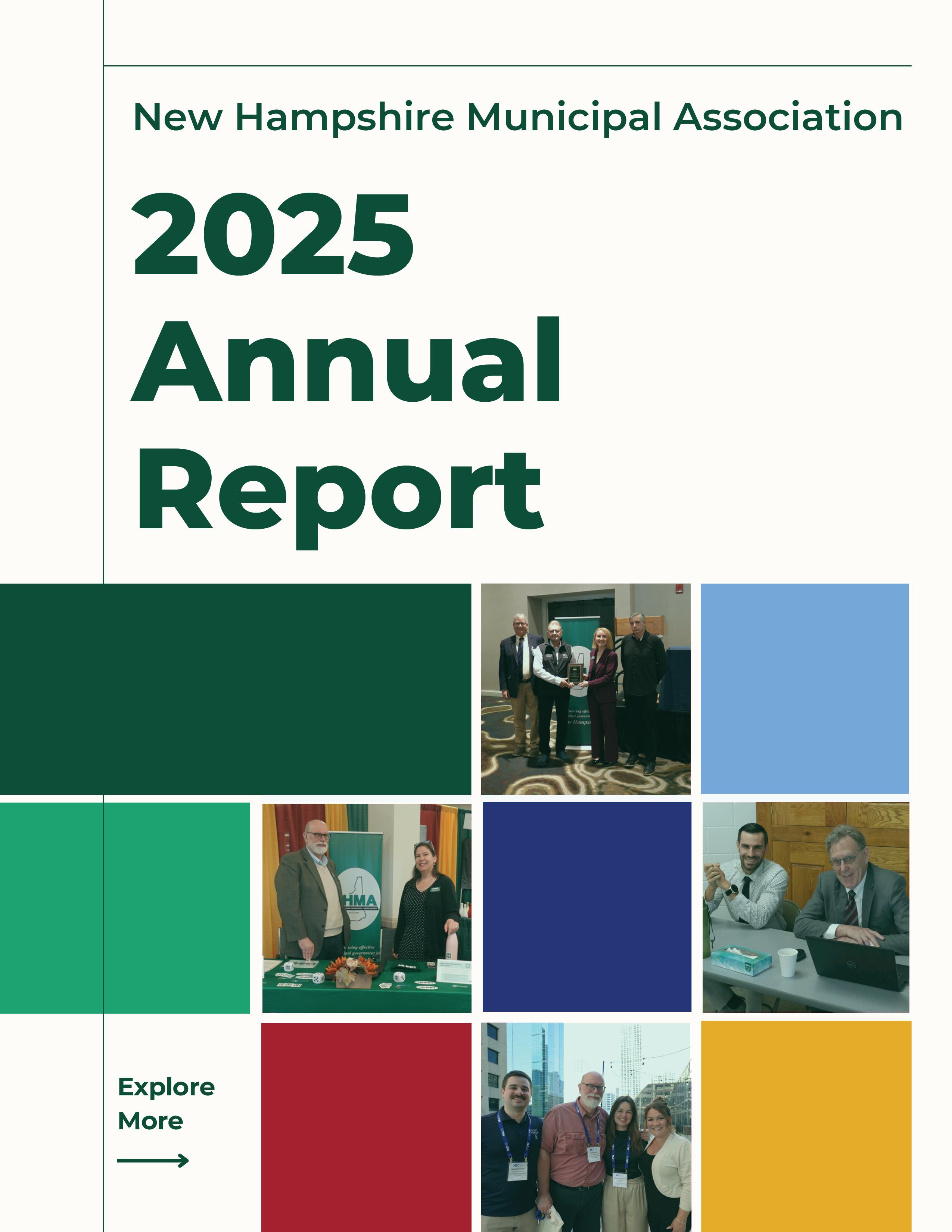 New Hampshire Municipal Association: NEW HAMPSHIRE TOWN AND CITY (USPS 379-620) (ISSN 0545-171X) is published 6 times a year for $25/member, $50/non-member per year, by the New Hampshire Municipal Association, 25 Triangle Park Drive, Concord, New Hampshire 03301. All rights reserved. Advertising rates will be furnished upon application. Periodical postage paid at Concord, NH 03302. POSTMASTER: Send address changes to NEW HAMPSHIRE TOWN AND CITY, 25 Triangle Park Drive, Concord, NH 03301. NEW HAMPSHIRE TOWN AND CITY serves as a medium for exchanging ideas and information on municipal affairs for officials of New Hampshire municipalities and county governments. Subscriptions are included as part of the annual dues for New Hampshire Municipal Association membership and are based on NHMA’s subscription policy. Nothing included herein is to