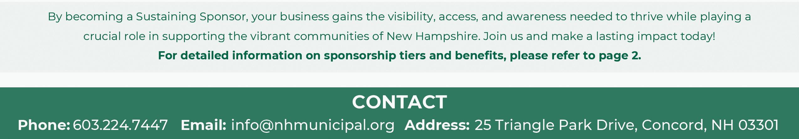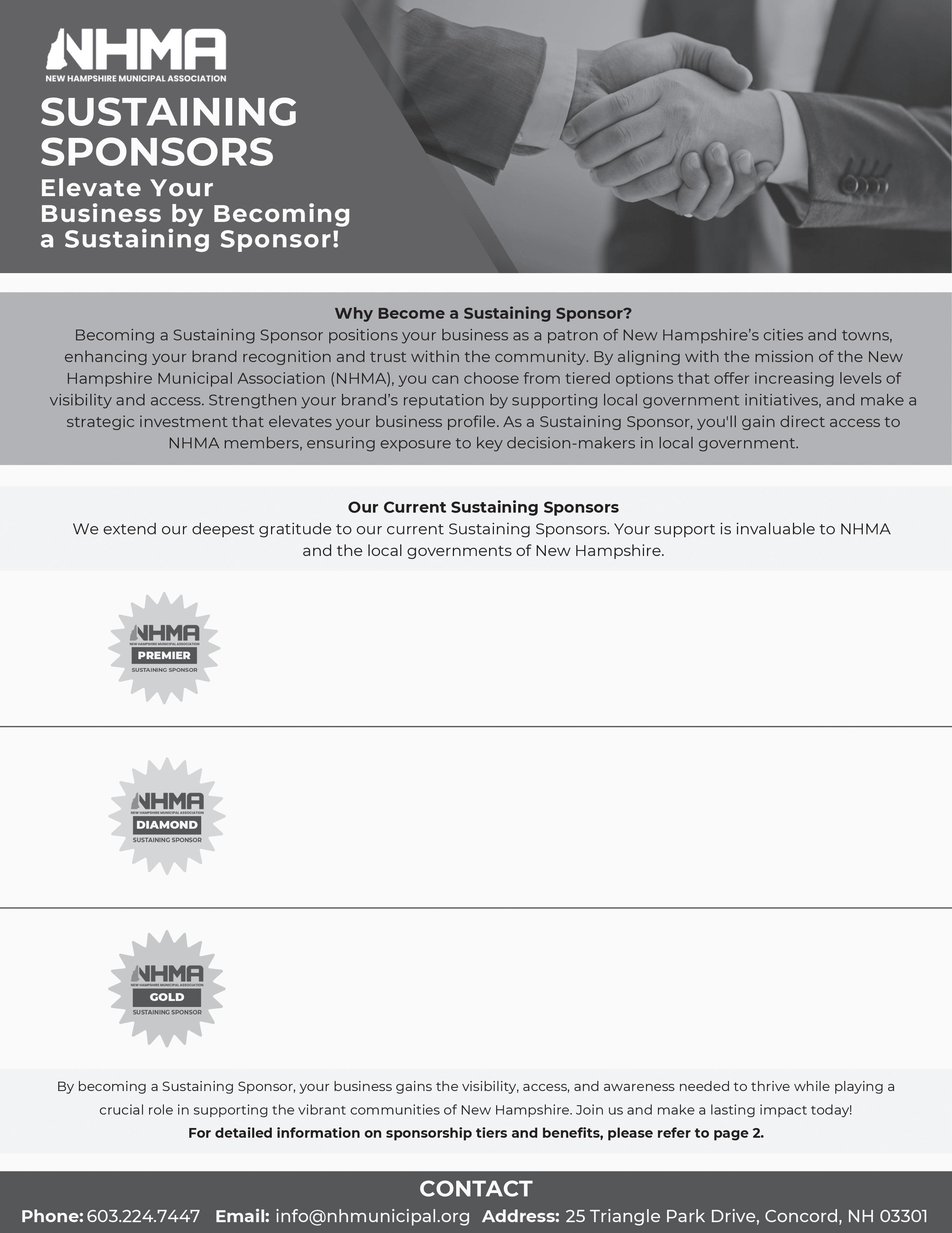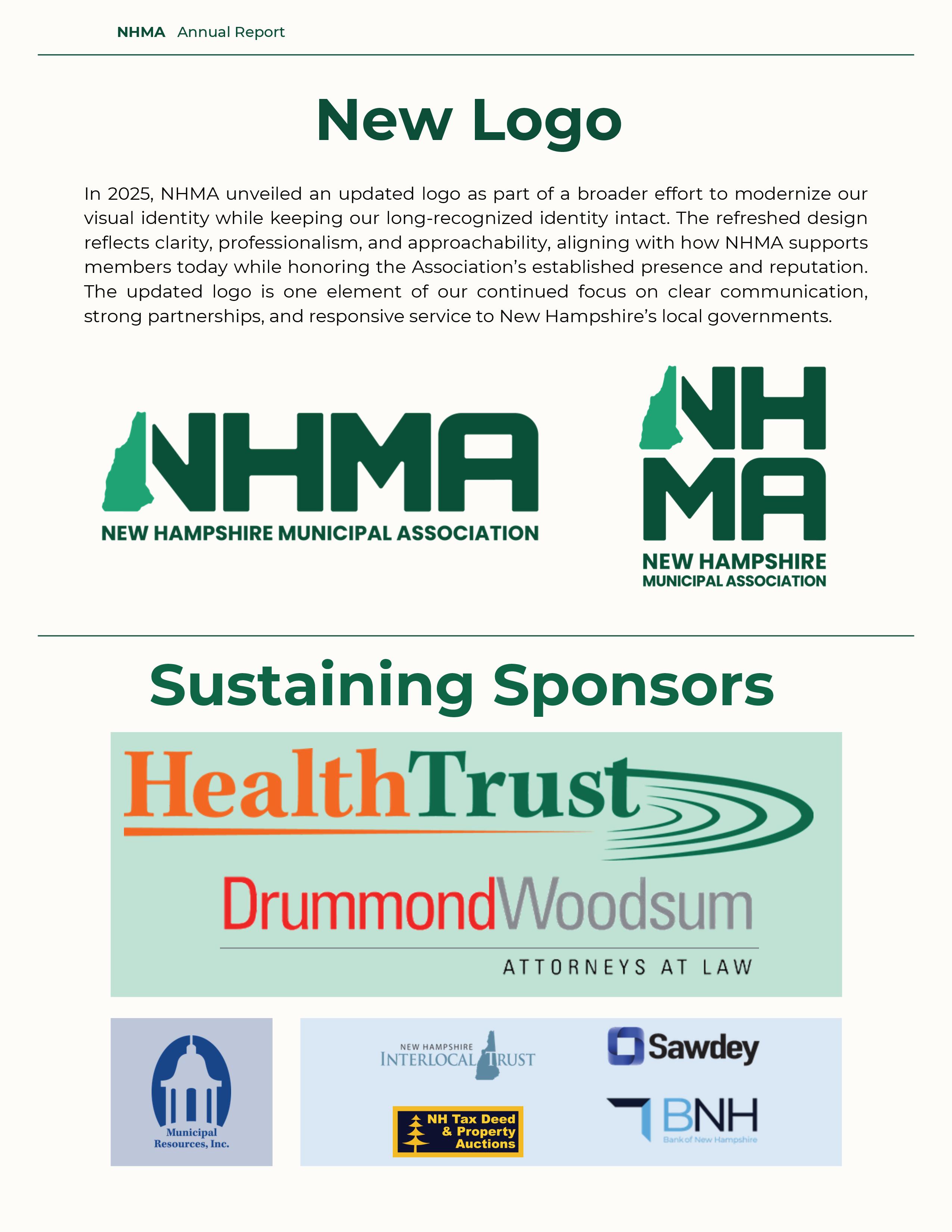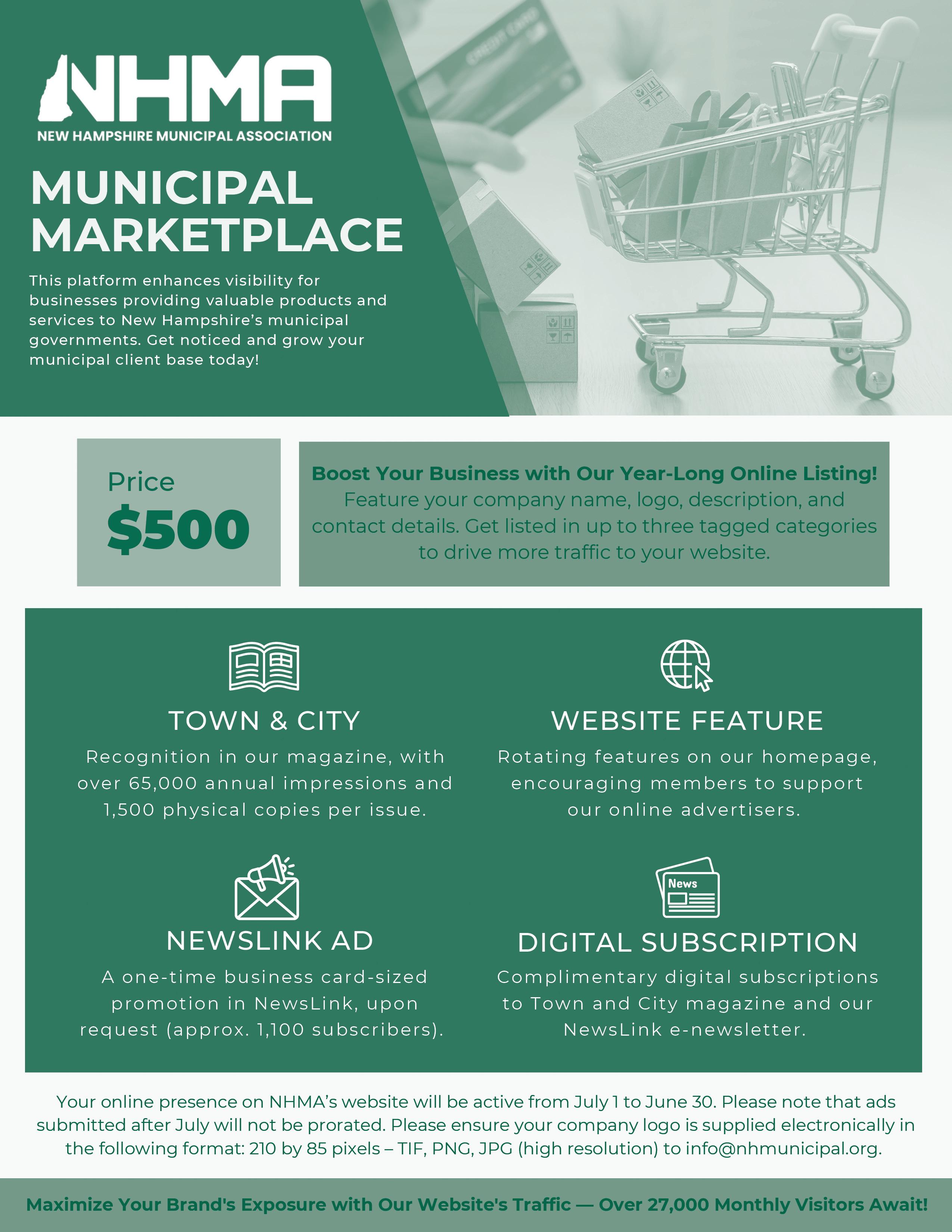 New Hampshire Municipal Association: NEW HAMPSHIRE TOWN AND CITY (USPS 379-620) (ISSN 0545-171X) is published 6 times a year for $25/member, $50/non-member per year, by the New Hampshire Municipal Association, 25 Triangle Park Drive, Concord, New Hampshire 03301. All rights reserved. Advertising rates will be furnished upon application. Periodical postage paid at Concord, NH 03302. POSTMASTER: Send address changes to NEW HAMPSHIRE TOWN AND CITY, 25 Triangle Park Drive, Concord, NH 03301. NEW HAMPSHIRE TOWN AND CITY serves as a medium for exchanging ideas and information on municipal affairs for officials of New Hampshire municipalities and county governments. Subscriptions are included as part of the annual dues for New Hampshire Municipal Association membership and are based on NHMA’s subscription policy. Nothing included herein is to