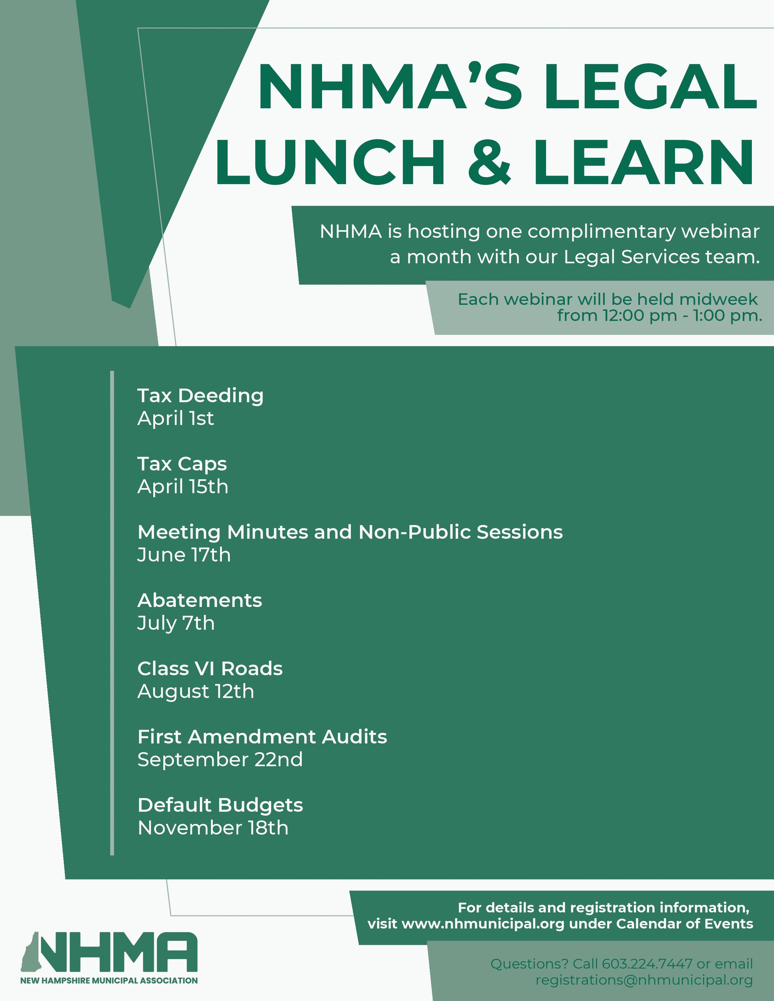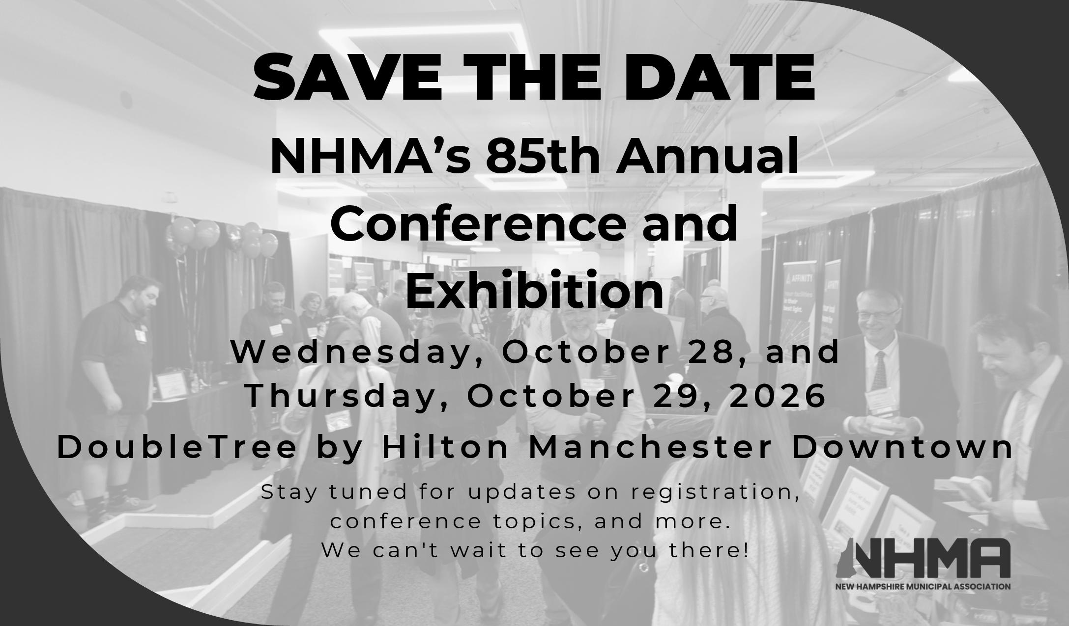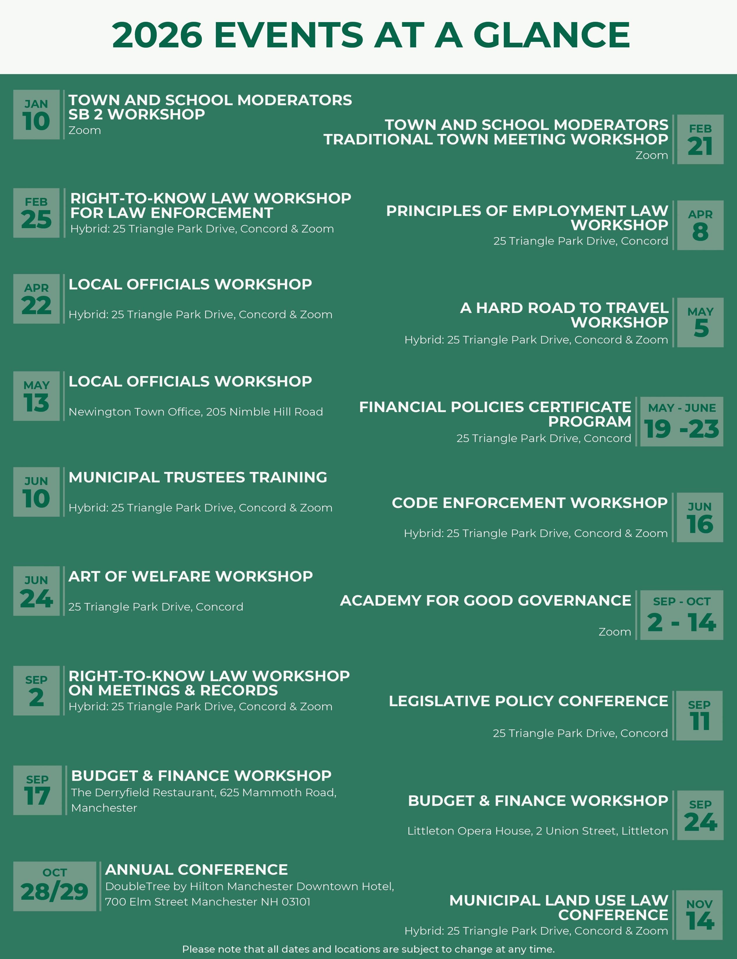 For the most up-to-date event and training information, please visit the NHMA website at www.nhmunicipal.org. Event times and dates are subject to change. Thank you.
