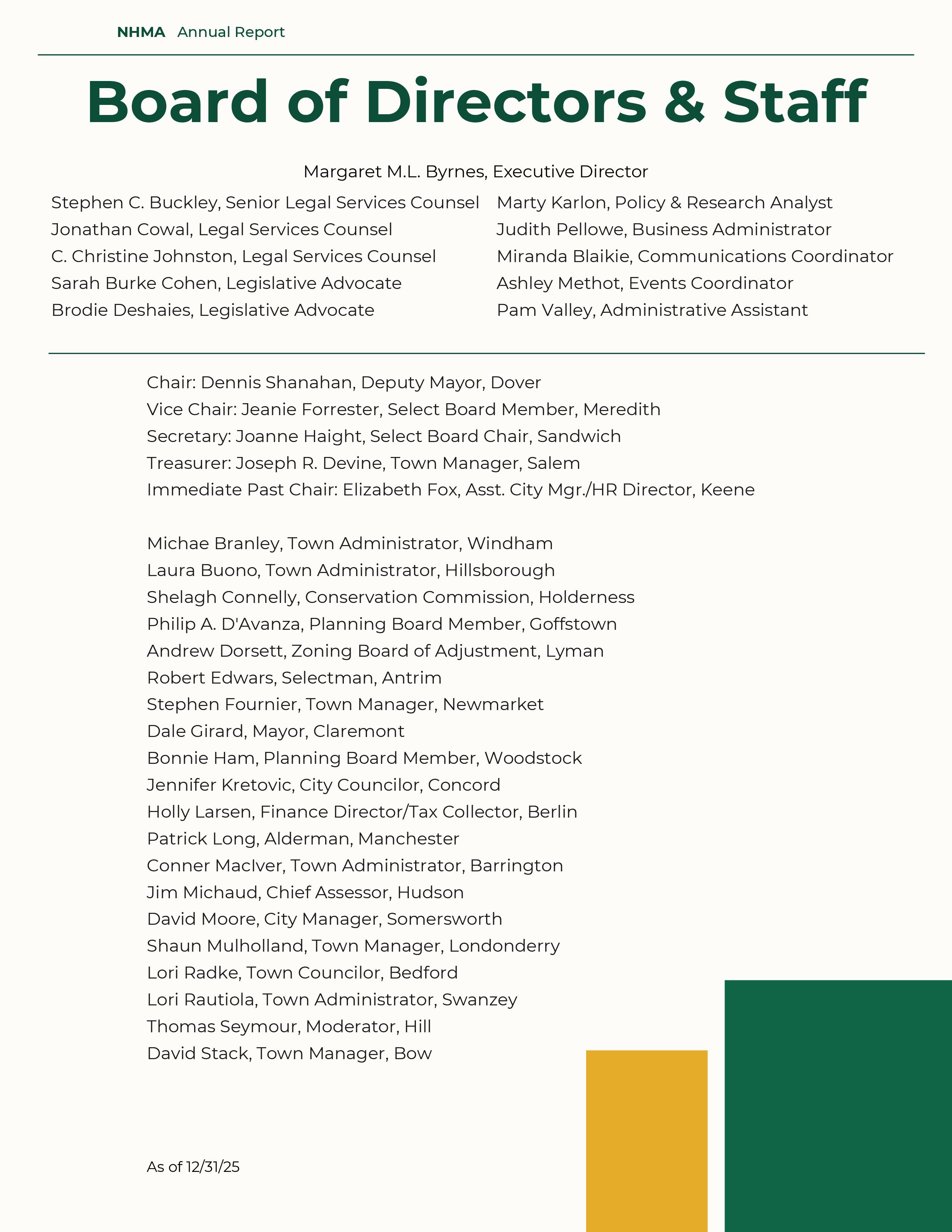 For more background on the success of state and local partnerships and the troubling drift to heavy-handed state preemption of local options, check out NHMA’s recently released whitepaper, “Room for Everyone,” which traces the roots of the housing deficit back nearly two decades, outlining the economic, demographic, and market forces that fueled rising prices and constrained supply. The NHMA paper, which was featured on WMUR-TV’s NH Business segment also advocates for renewed partnership between the state and municipalities, emphasizing that effective housing policy must include infrastructure investment, targeted incentives, and flexible, locally tailored tools.