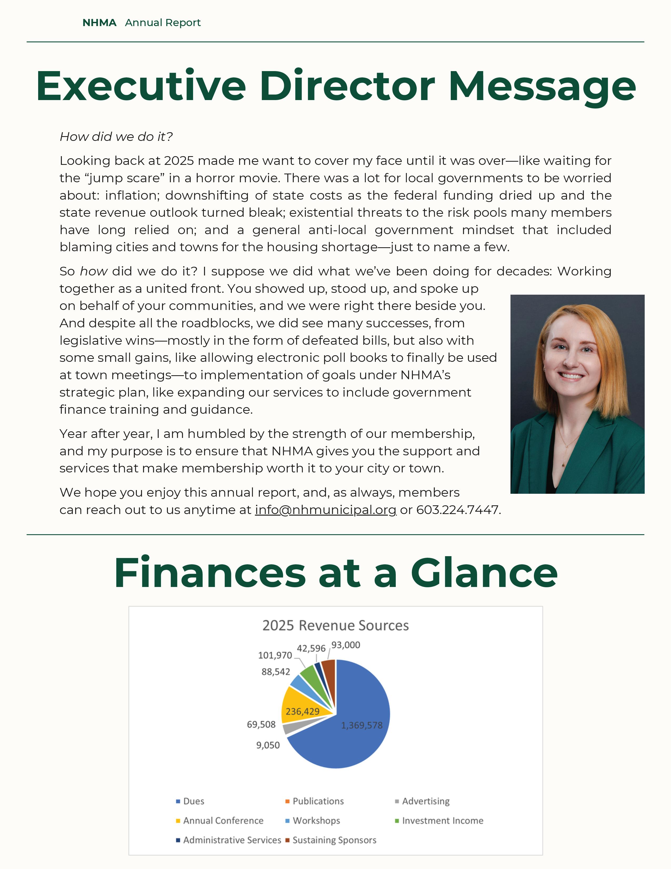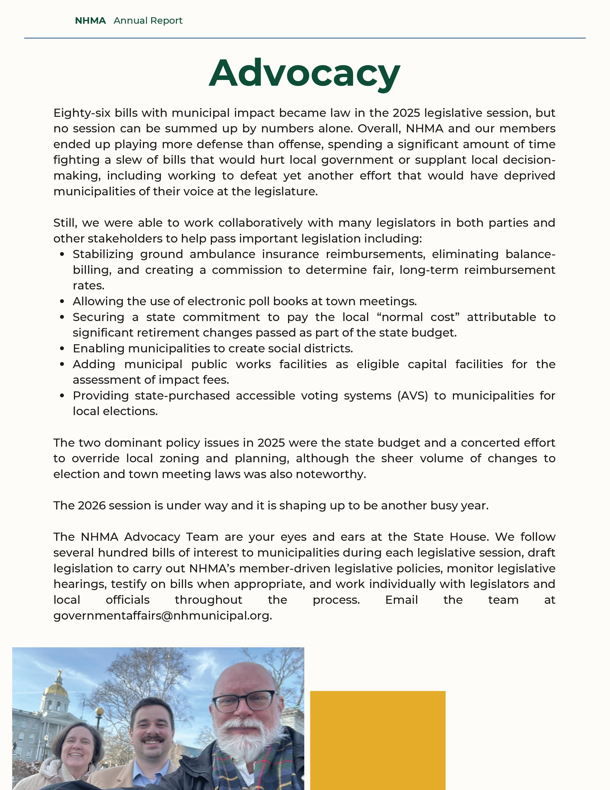 This theme also continues to dominate the housing debate, although we are pleased to see that both legislators and even the media are starting to appreciate the local perspective. To shed even more light on that perspective, NHMA produced a new whitepaper, Room for Everyone. This publication is not only a key informational document for legislators, local officials, and taxpayers, it also reflects a commitment in our strategic plan to amplify the local government voice by producing more educational and informational public policy materials. The whitepaper, which was featured on WMUR’s NH Business with Fred Kocher in February, shows that the zoning preemption and “blame municipalities” approach to addressing the housing crisis is a smokescreen. We will continue to work to roll back or fix poorly drafted and burdensome mandates that are already affecting many of your communities.