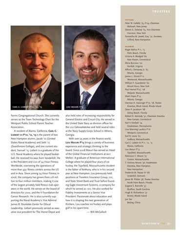 Farms Congregational Church. She currently serves as the Town Technology Chair for the Westport Public School Parent Teacher Association. A resident of Alamo, California, Carl C. Liebert iii P’10, ’12, ’15 is the parent of two New Hampton alumni, Jacob ’10 (United States Naval Academy) and Seth ’12 (Swarthmore College), and one current student, Samuel ’15. Liebert is a graduate of the U.S. Naval Academy where he played basketball. He received his mba from Vanderbilt. He is the President and ceo of 24 Hour Fitness Worldwide, overseeing the operations of more than 430 fitness centers across the US and in Asia. Since joining 24 Hour Fitness in 2006, the company has grown from 2.8 million to four million members, making it one of the largest privately held fitness club operators in the world. He serves on the board of directors for usaa, and the V Foundation for Cancer Research. He is also currently supporting the Naval Academy’s Vice Admiral James B. Stockdale Center for Ethical Leadership. Liebert previously served as executive vice president for The Home Depot and