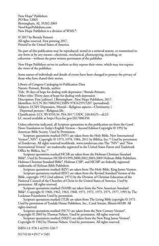 New Hope® Publishers PO Box 12065 Birmingham, AL 35202-2065 NewHopePublishers.com New Hope Publishers is a division of WMU®. © 2017 by Brenda Poinsett All rights reserved. First printing 2017. Printed in the United States of America. No part of this publication may be reproduced, stored in a retrieval system, or transmitted in any form or by any means—electronic, mechanical, photocopying, recording, or otherwise—without the prior written permission of the publisher. New Hope Publishers serves its authors as they express their views, which may not express the views of the publisher. Some names of individuals and details of events have been changed to protect the privacy of those who have shared their stories. Library of Congress Cataloging-in-Publication Data Names: Poinsett, Brenda, author. Title: 30 days of hope for dealing with depression / Brenda Poinsett. Other titles: Thirty days of hope for dealing with depression Description: First [edition]. | Birmingham : New Hope Publishers, 2017. Identifiers: LCCN 2017006350 | ISBN 9781625915207 (permabind) Subjects: LCSH: Depression, Mental—Religious aspects—Christianity. | Depressed persons—Religious life. Classification: LCC BV4910.34 .P64 2017 | DDC 248.8/625—dc23 LC record available at https://lccn.loc.gov/2017006350 Unless otherwise indicated, all Scripture quotations in this publication are from the Good News Translation in Today’s English Version—Second Edition Copyright © 1992 by American Bible Society. Used by Permission. Scripture quotations marked (NIV) are taken from the Holy Bible, New International Version®, NIV®. Copyright © 1973, 1978, 1984, 2011 by Biblica, Inc.tm Used by permission of Zondervan. All rights reserved worldwide. www.zondervan.com The “NIV” and “New International Version” are trademarks registered in the United States Patent and Trademark Office by Biblica, Inc.tm Scripture quotations marked HCSB are taken from the Holman Christian Standard Bible®, Used by Permission HCSB ©1999,2000,2002,2003,2009 Holman Bible Publishers. Holman Christian Standard Bible®, Holman CSB®, and HCSB® are federally registered trademarks of Holman Bible Publishers. Scripture quotations marked (KJV) are taken from The Holy Bible, King James Version. Scripture quotations marked (RSV) are taken from the Revised Standard Version of the Bible, copyright 1952 [2nd edition, 1971] by the Division of Christian Education of the National Council of the Churches of Christ in the United States of America. Used by permission. All rights reserved. Scripture quotations marked (NASB) are taken from the New American Standard Bible®, Copyright © 1960, 1962, 1963, 1968, 1971, 1972, 1973, 1975, 1977, 1995 by The Lockman Foundation Used by permission. Scripture quotations marked (TLB) are taken from The Living Bible copyright © 1971. Used by permission of Tyndale House Publishers, Inc., Carol Stream, Illinois 60188. All rights reserved. Scripture quotations marked (NCV) are taken from the New Century Version®. Copyright © 2005 by Thomas Nelson. Used by permission. All rights reserved. Scripture quotations marked (NKJV) are taken from the New King James Version®. Copyright © 1982 by Thomas Nelson. Used by permission. All rights reserved. ISBN-13: 978-1-62591-520-7 N174118 • 0517 • 1M1