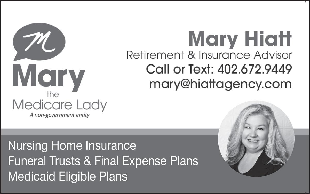 Mary Hiatt is a Retirement & Insurance Advisor and President of Mary the Medicare Lady (A non-government entity.) She is Certified in Long Term Care Programs, Policies, & Partnerships and Annuities. She offers Educational Workshops on Medicare, Long Term Care and more at no charge. She helps retirees convert their 401Ks and IRA’s into guaranteed income streams as well as helping clients get Medicaid with eligible spend-down plans and Funeral Expense Trusts. Not connected with or endorsed by the U.S. government or the federal Medicare program. Medicare Supplement insurance plans are not connected with or endorsed by the U.S. government or the federal Medicare program. See www.hiattagency.com or contact licensed independent agent mary@hiattagency.com or call or text 402-672-9449 for more information.