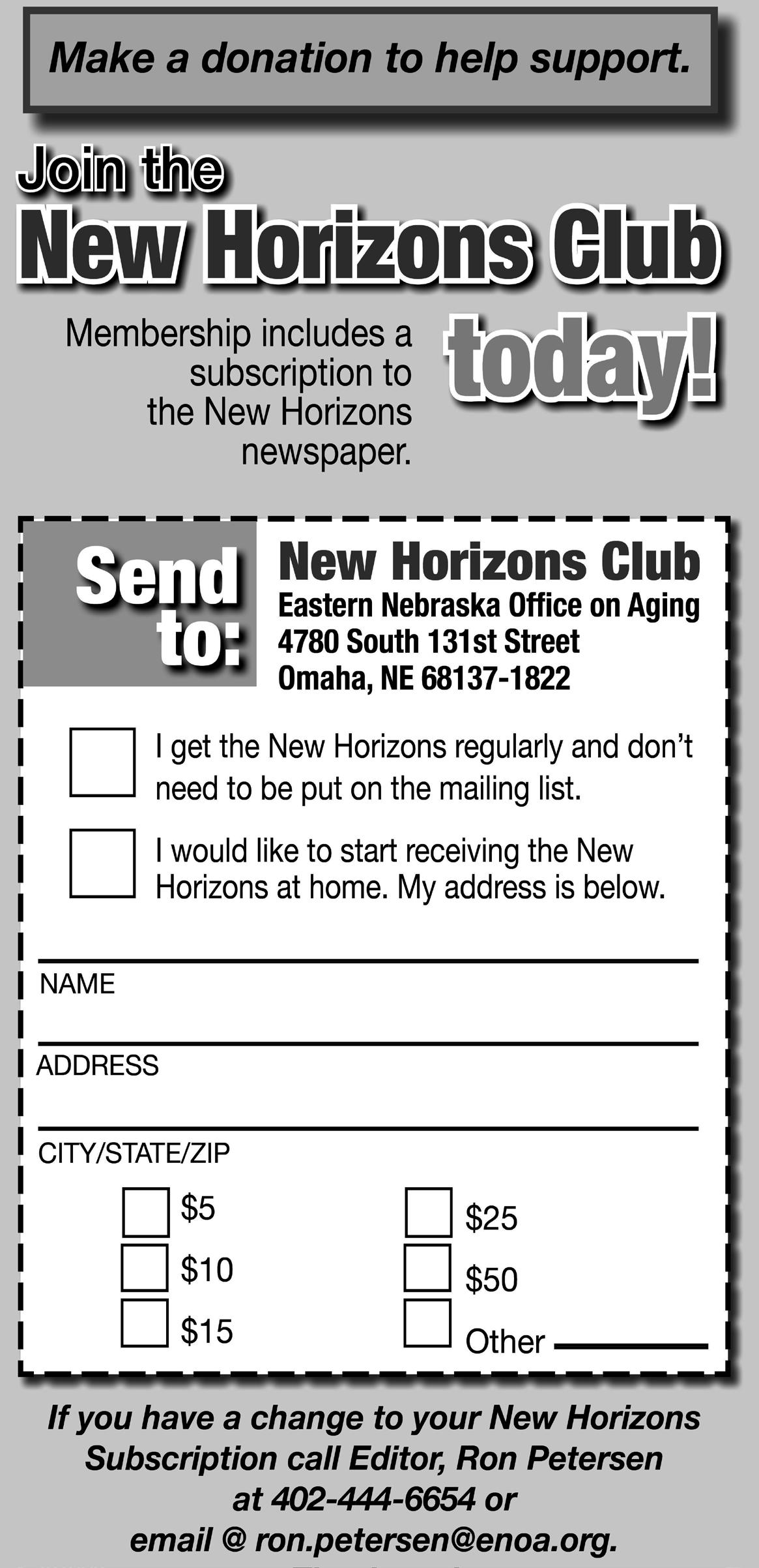 New Horizons is the official publication of the Eastern Nebraska Office on Aging. The paper is distributed free to people over age 60 in Douglas, Sarpy, Dodge, Washington, and Cass counties. Those living outside the five-county region may subscribe for $5 annually. Address all correspondence to: Ron Petersen, Editor, 4780 S. 131st Street, Omaha, NE 68137-1822. Phone 402-444-6654. FAX 402-444-3076.