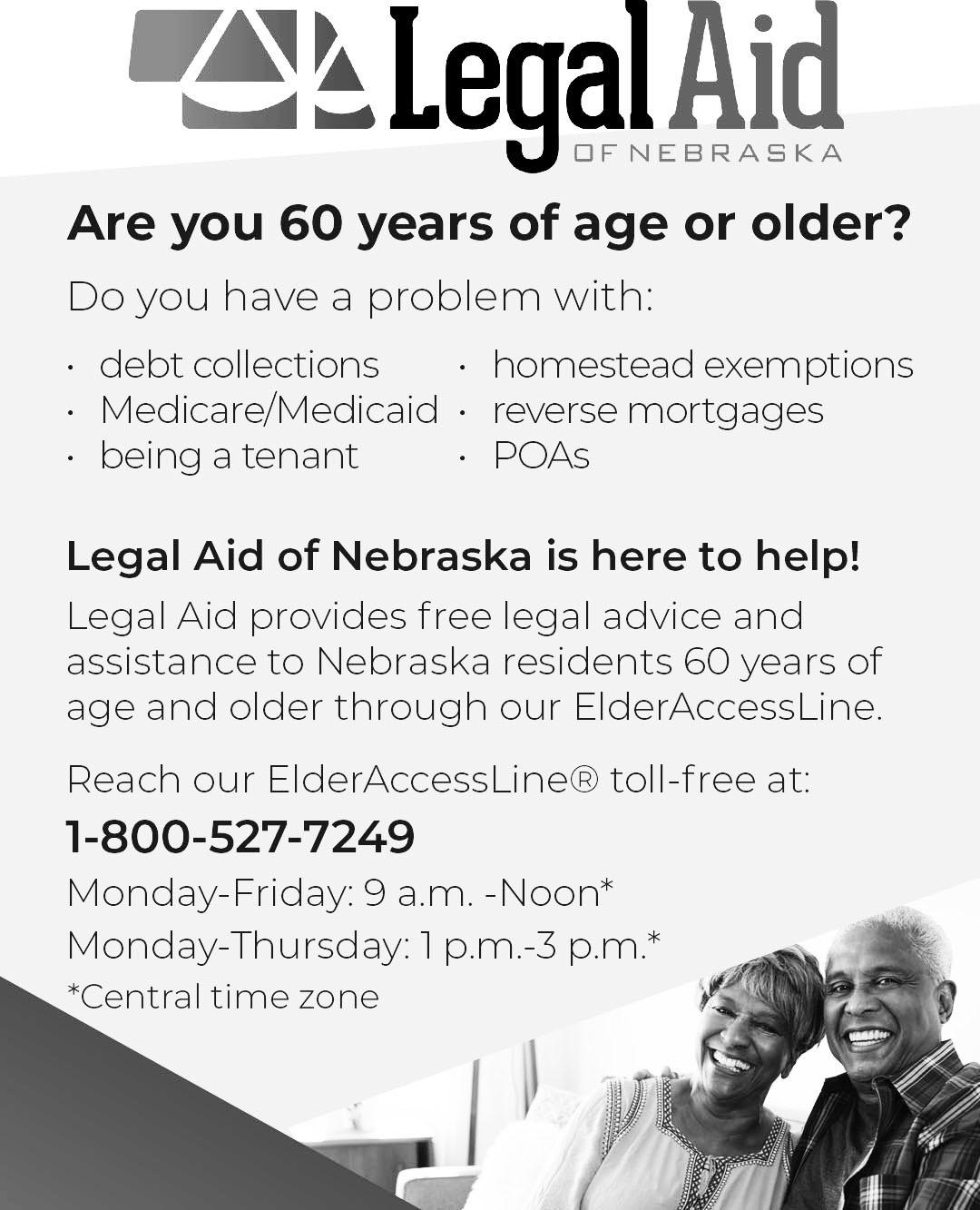 Legal Aid of Nebraska operates a free telephone access line for Nebraskans ages 60 and older.