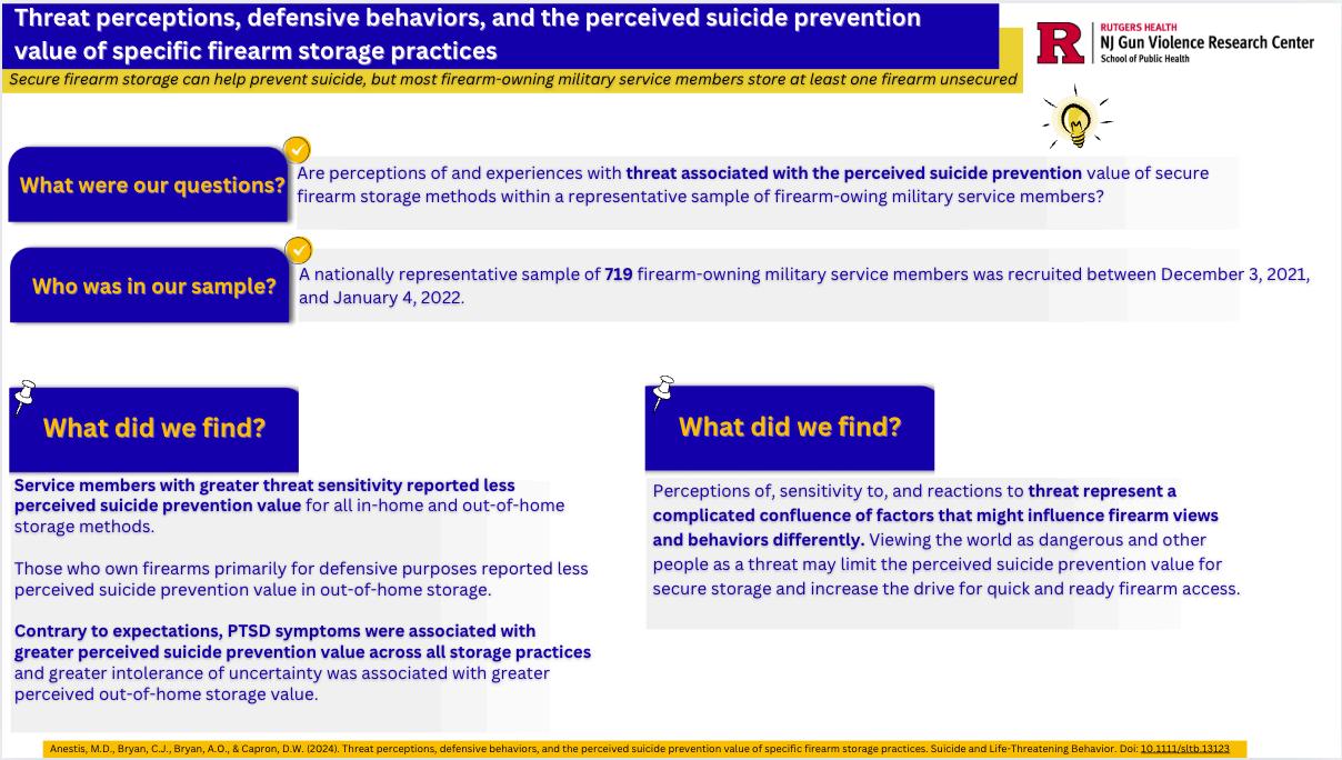 Those who own firearms primarily for defensive purposes reported less perceived suicide prevention value in out-of-home storage. Contrary to expectations, PTSD symptoms were associated with greater perceived suicide prevention value across all storage practices, and greater intolerance of uncertainty was associated with greater perceived out-of-home storage value,” said lead author Michael Anestis, executive director of the New Jersey Gun Violence Research Center at Rutgers.