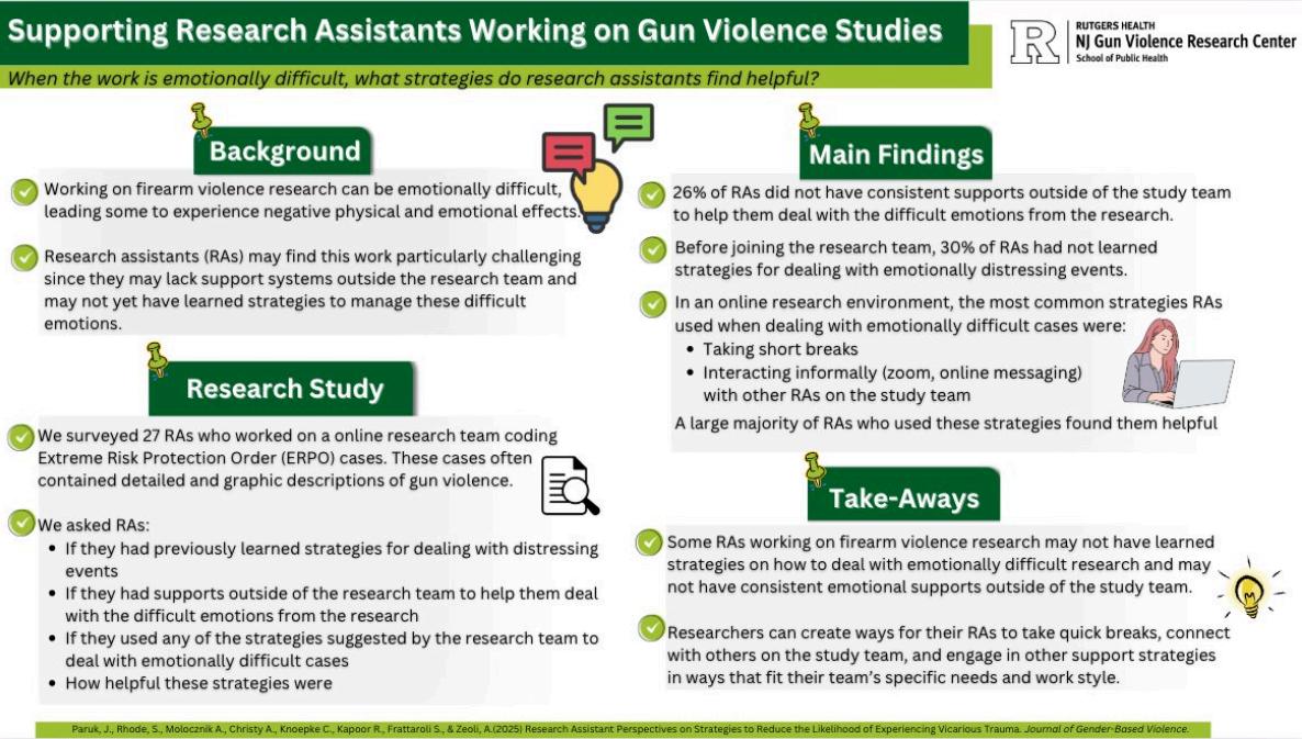 “Gun violence prevention work can involve emotionally difficult topics such as suicide, intimate partner abuse, and more,” said Jennifer Paruk, a postdoctoral fellow at the New Jersey Gun Violence Research Center at the Rutgers School of Public Health.”