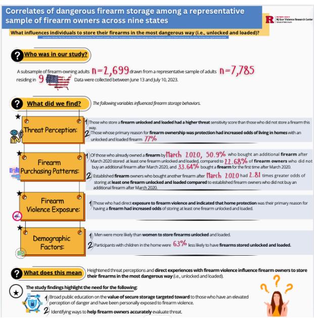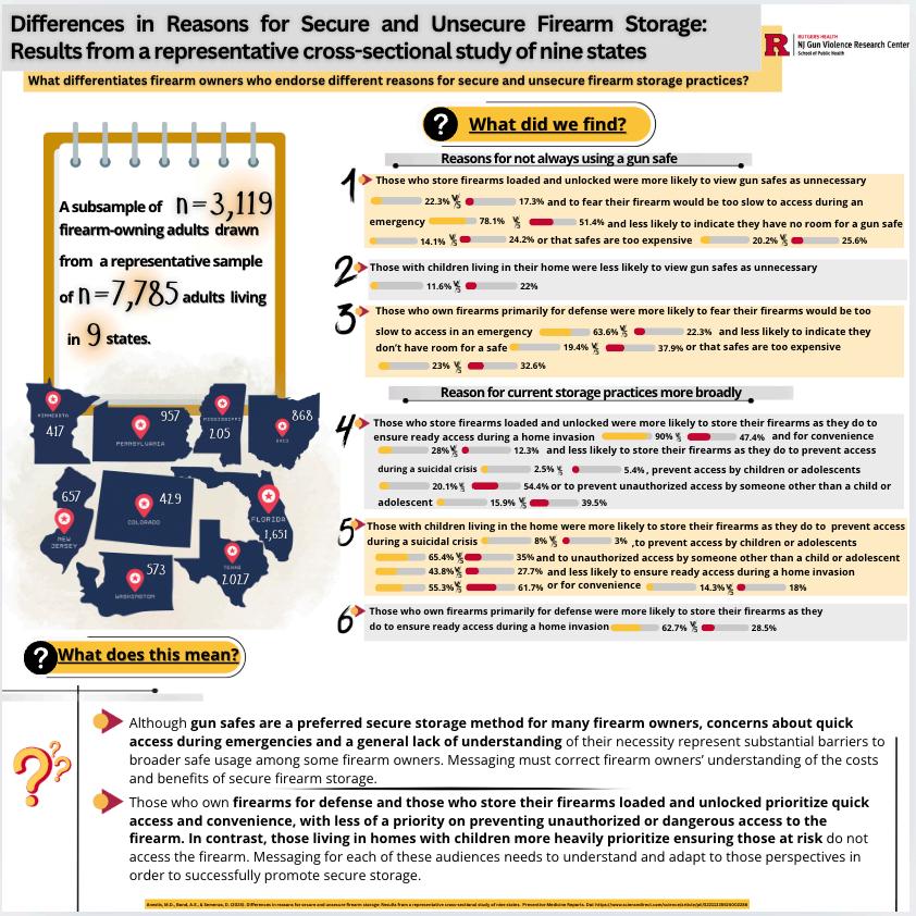 The current study extends knowledge of what influences individuals to store their firearms unlocked and loaded by considering the aforementioned factors (threat perceptions, exposure to violence/negative experiences, and timing of firearm purchasing) simultaneously within a representative sample of adults from nine diverse states (Texas, Colorado, Florida, Minnesota, New Jersey, Ohio, Pennsylvania, and Washington) that have significant differences in firearm laws, firearm culture, and political leanings. Lead author,Jayna Moceri-Brooks lead author and a postdoctoral researcher at the New Jersey Gun Violence Research Center