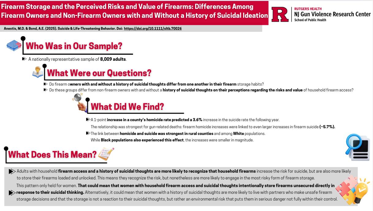 Alarmingly, those with firearms in the home and a history of thinking about suicide were more likely to store firearms in the least secure manner possible: loaded and unlocked,” said lead author Michael Anestis, executive director of the New Jersey Gun Violence Research Center. ReadtheRutgersTodayreleasehere.