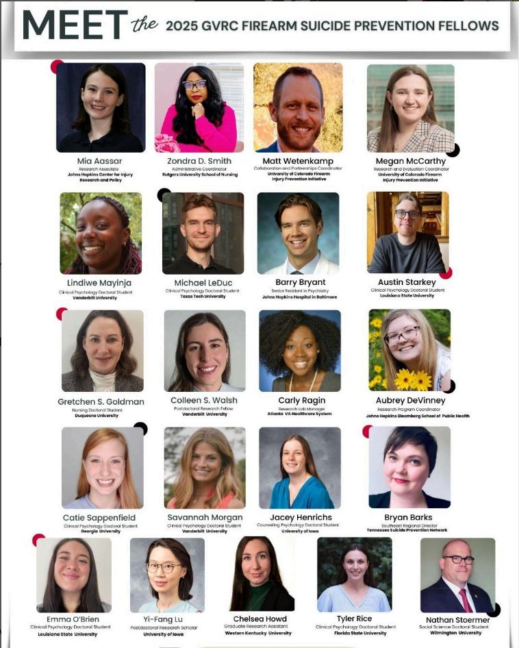 This past year, the GVRC continued to welcome in new trainees, published a number of impactful peer reviewed manuscripts, secured externally funded grants, and regularly engaged with the media. We hosted the inaugural GVRC firearm suicide prevention fellowship. In this event, 21 young scholars were selected from a competitive pool of applicants and hosted for a full day of training and networking aimed at encouraging them to build careers around firearm suicide prevention The event featured trainees from all over the country and from many fields, including psychology, criminal justice, and nursing, with renown faculty lending their time to help create a community of scientists supporting the work of a new generation