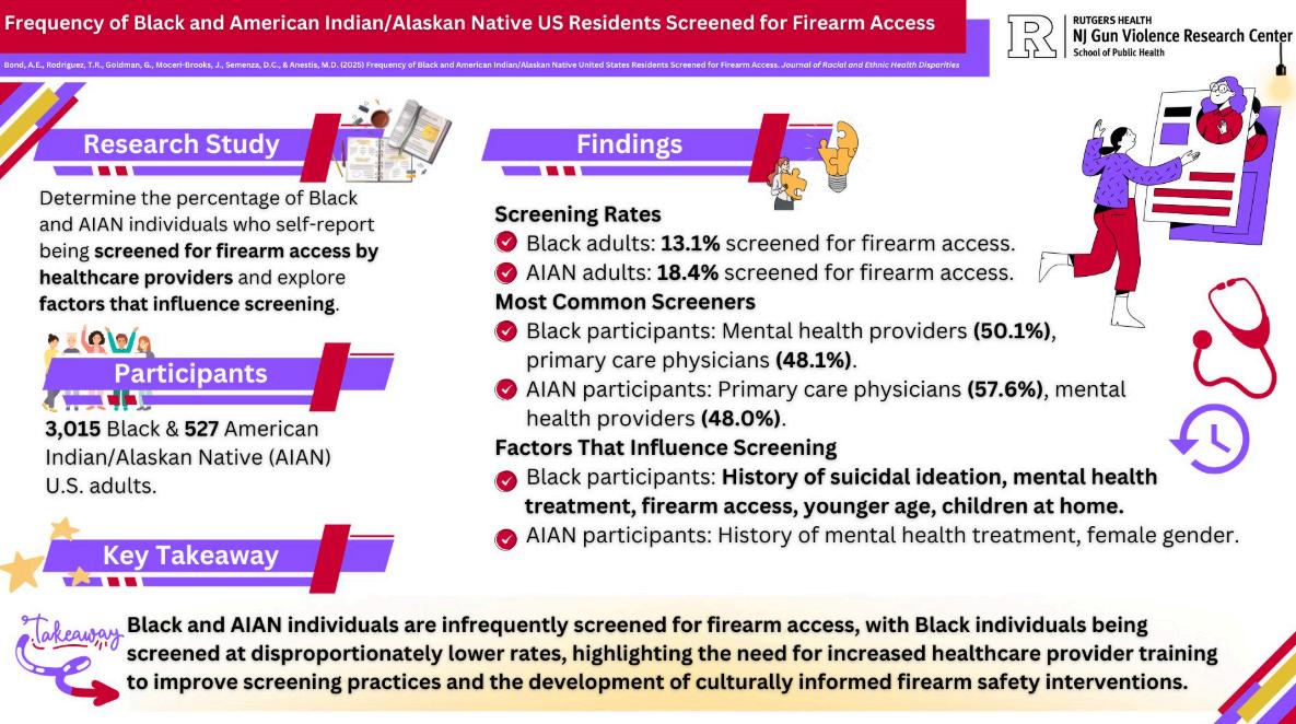 “Among Black participants, 13.1% and among AIAN participants, 18 4% reported being screened for firearm access Of the participants who reported being screened, most have been by mental healthcare providers or primary care physicians. Factors associated with higher screening odds in Black adults included history of suicidal ideation or mental health treatment, current firearm access, younger age, and having children at home.” Lead author, Allison Bond, is an Assistant Professor at the New Jersey Gun Violence Research Center