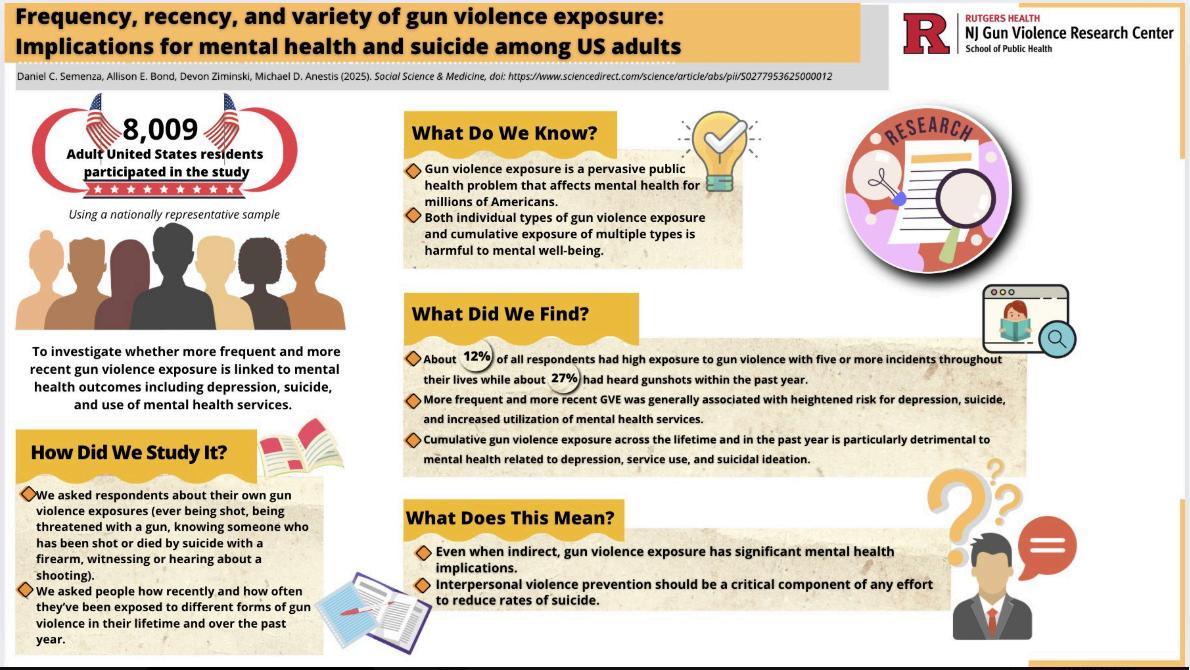 “This is the first study using nationally representative data that demonstrates a link between exposure to gun violence and suicide,” said lead author Daniel Semenza, director of research at the New Jersey Gun Violence Research Center and assistant professor at the Department of Urban-Global Public Health at the Rutgers School of Public Health and in the Department of Sociology, Anthropology and Criminal Justice at Rutgers University “When we think about what we can do to improve suicide prevention efforts, we have to include interpersonal violence prevention in the conversation ” ReadtheRutgersTodayreleasehere.