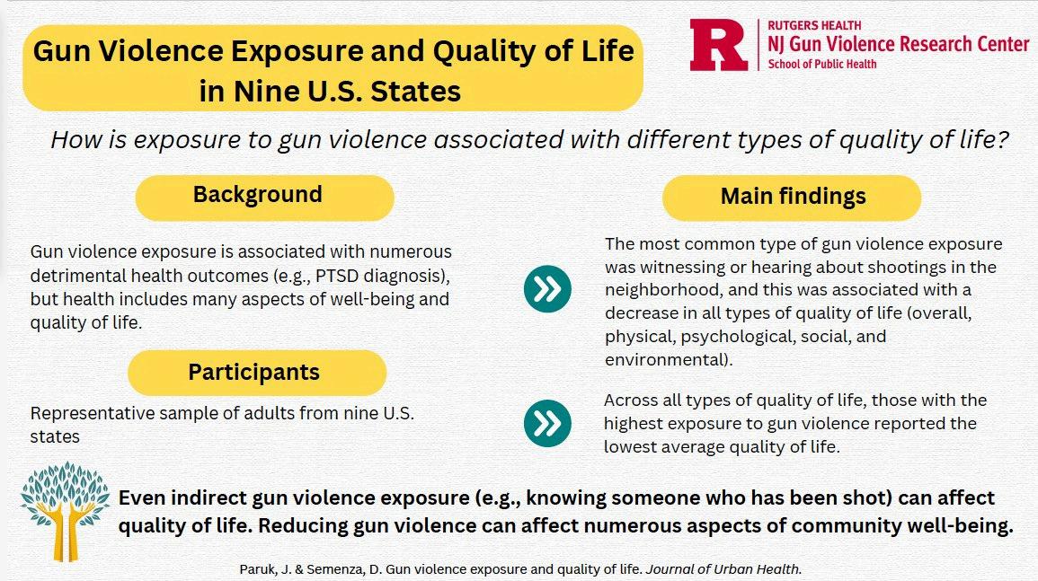 "We found that witnessing or hearing about a shooting in your neighborhood was the most common type of gun violence exposure, and it was associated with a decrease in quality of life across all five domains we measured," said lead author Jennifer Paruk, lead author and a postdoctoral researcher at the New Jersey Gun Violence Research Center at the Rutgers School of Public Health ReadtheRutgersTodayreleasehere.