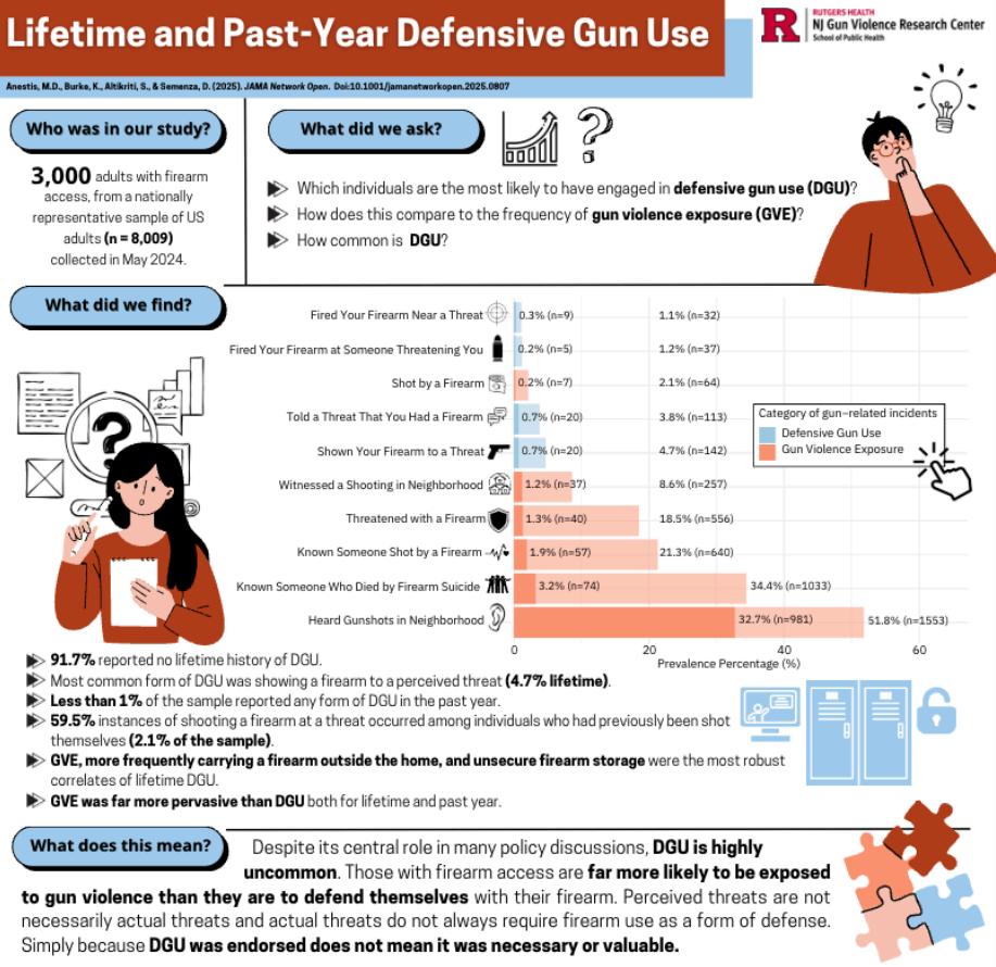 Research from the New Jersey Gun Violence Research Center at Rutgers School of Public Health found that 92% of gun owners have never used their guns to protect themselves, and less than 1% have done so in the last year The study also found that people who view the world as unsafe are often distrustful of others and may be more likely to want a gun