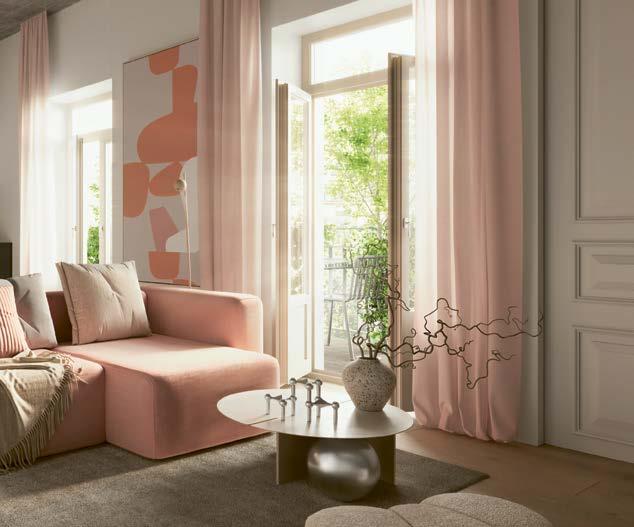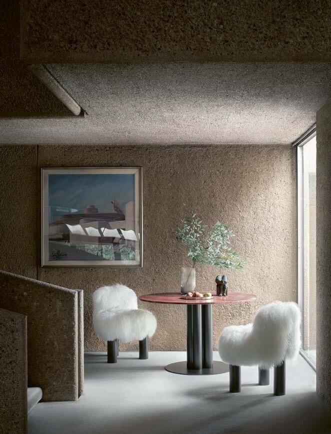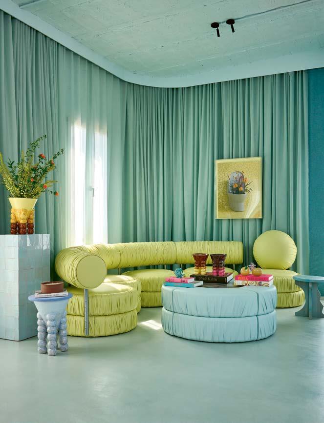 kontrasty textur — vlněné bouclé, přírodní vídeňský výplet, barevné sklo nebo keramika,“ popisuje architektka Barbora S. Babocká.