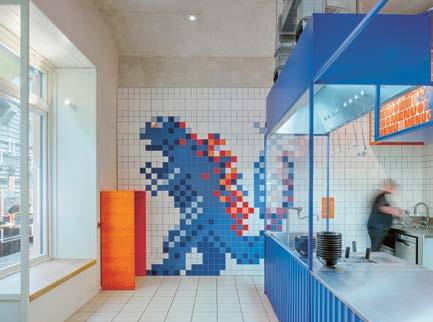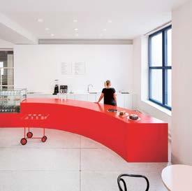 ❺ Součástí ATLASu je také kavárna s jasně červeným barovým pultem. Nabízí komornější a klidnější prostředí než frekventovaný Kolektor v přízemí budovy.