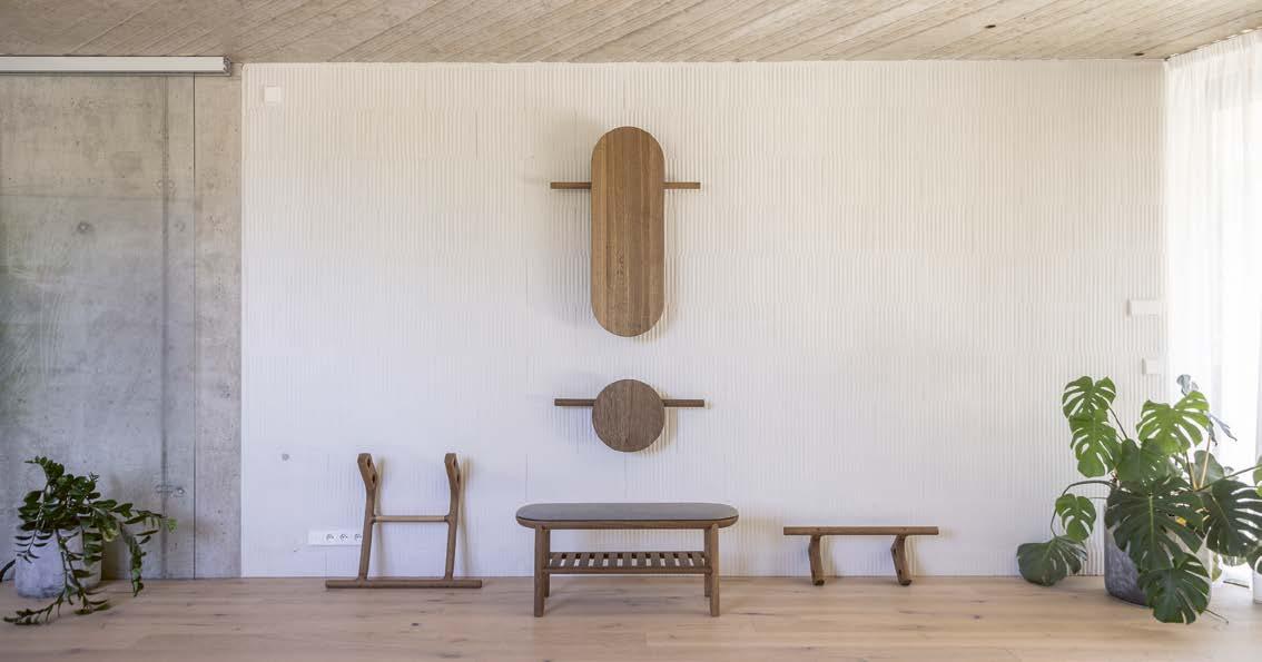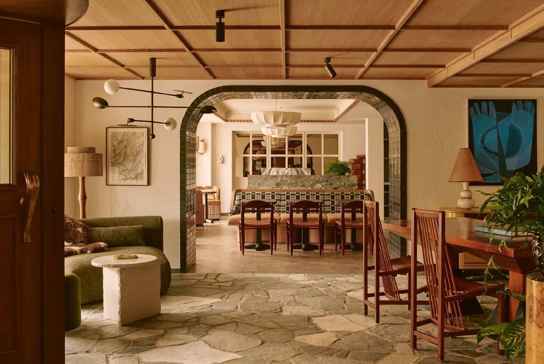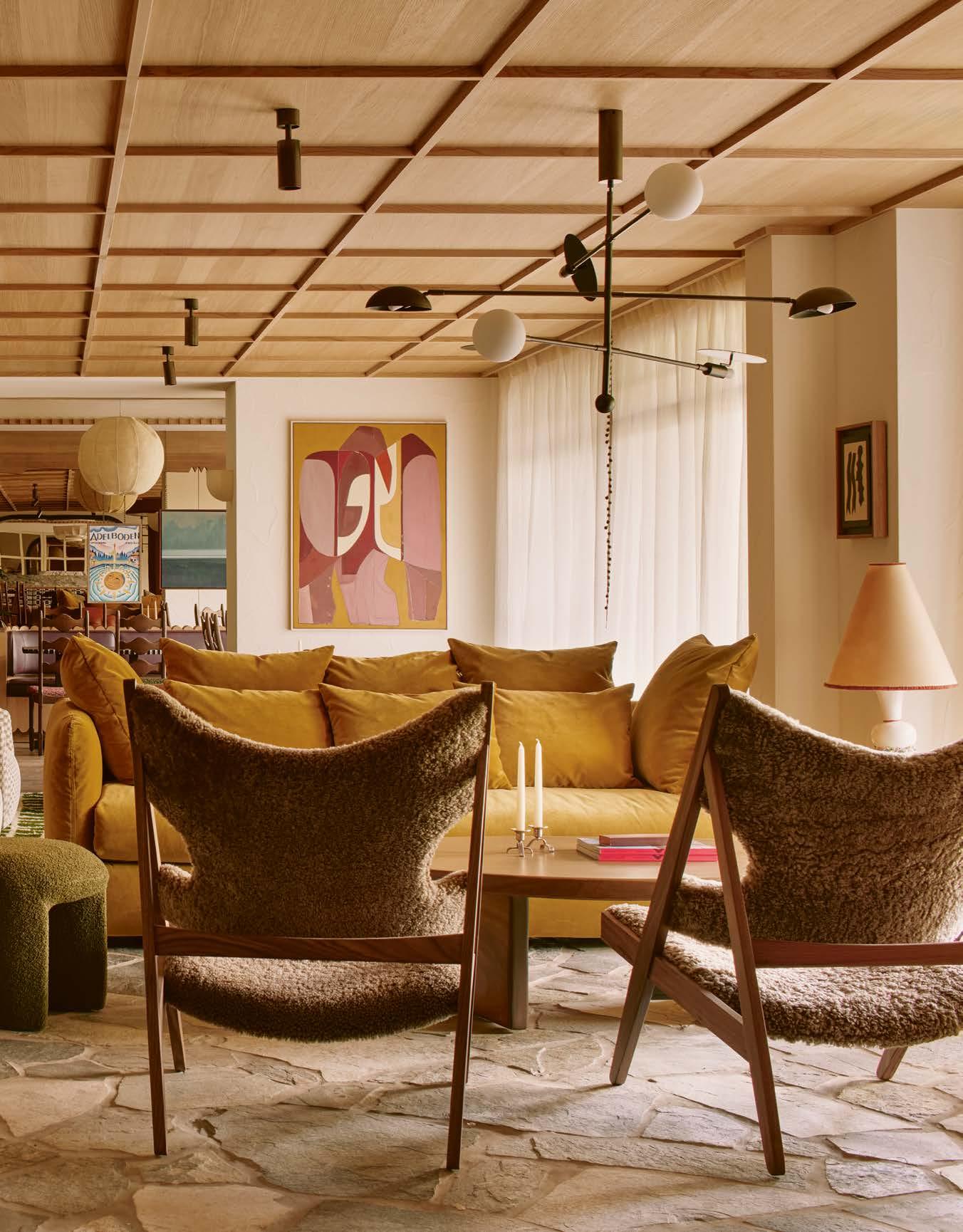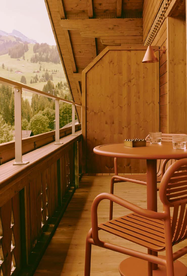 barev a přirozenými, uklidňujícími texturami propojenými s hrubšími přírodními detaily. „Naším cílem bylo vytvořit útočiště pro ty, kteří hledají soukromí a klid, s důrazem na pohodlí domova propojené s nejlepšími prvky tradiční švýcarské pohostinnosti. Každý pokoj a apartmá jsou elegantně a pragmaticky zařízeny vybranou směsí současných a historických nábytkových kousků i uměním z amsterdamské galerie Bisou,“ uzavírá Vines. Vše dohromady namixované v eklektickém koktejlu společně s autentickými vintage kousky a povrchovými materiály té nejvyšší kvality. Vinesův tým vytvořil i několik unikátních prvků mobiliáře, včetně dřevěné lavice ve společných prostorách nebo křesla a stolku v nejluxusnějším dvoupatrovém apartmá.