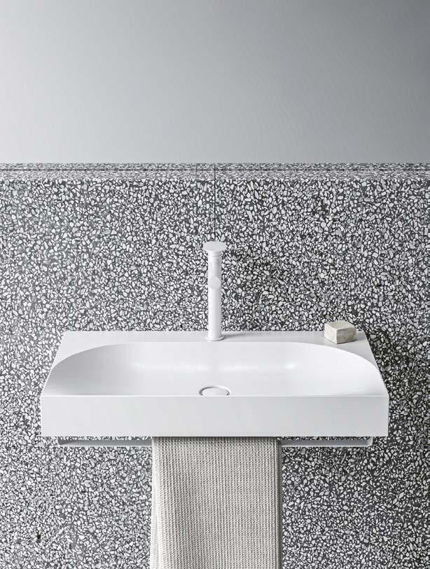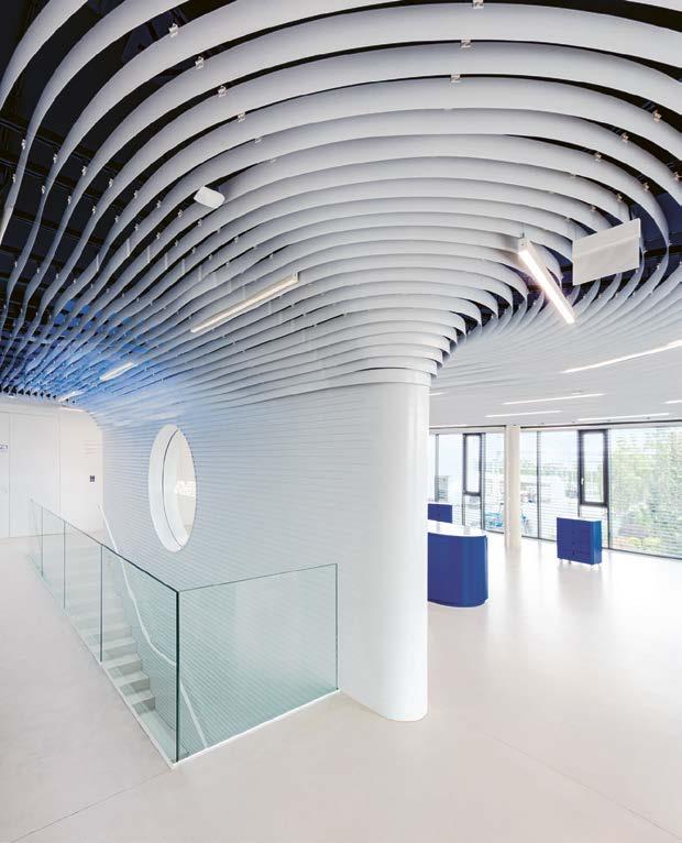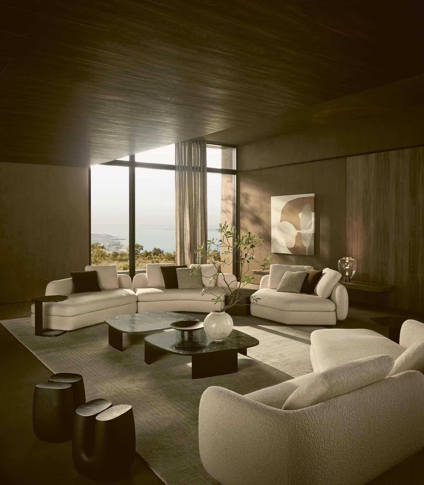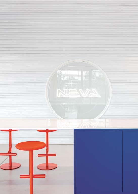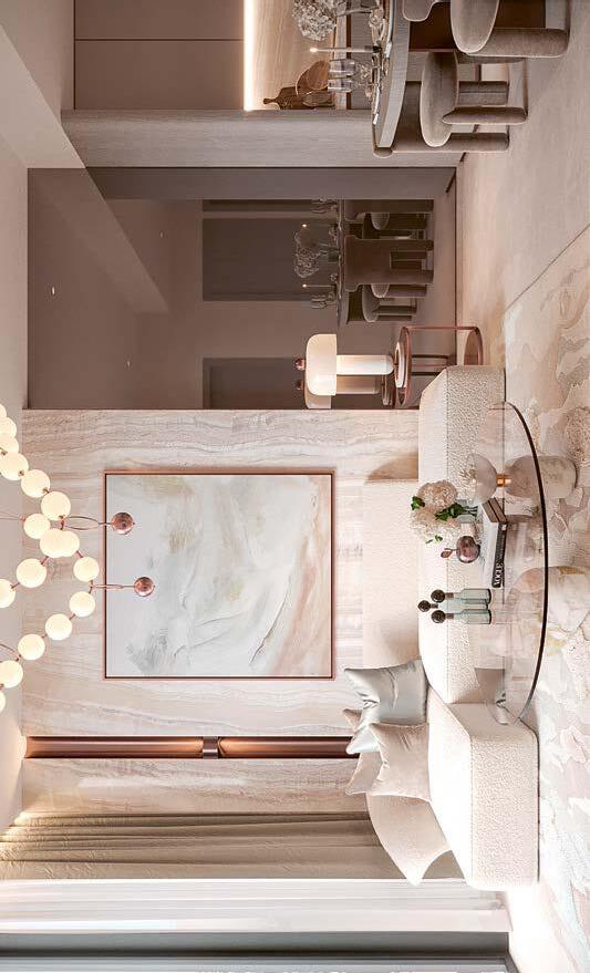 nábytek❶dodávají prostoru na útulnosti. Důležitou roli hrají i strukturované textilní potahy pečlivě vybraného nábytku, například křesel Knitting od značky Audo Copenhagen v popředí. Lustr je z produkce značky 101 CPH. Veškeré truhlářské výrobky a madla s přírodními oblázky navrhlo na míru přímo studio Nicemakers.
