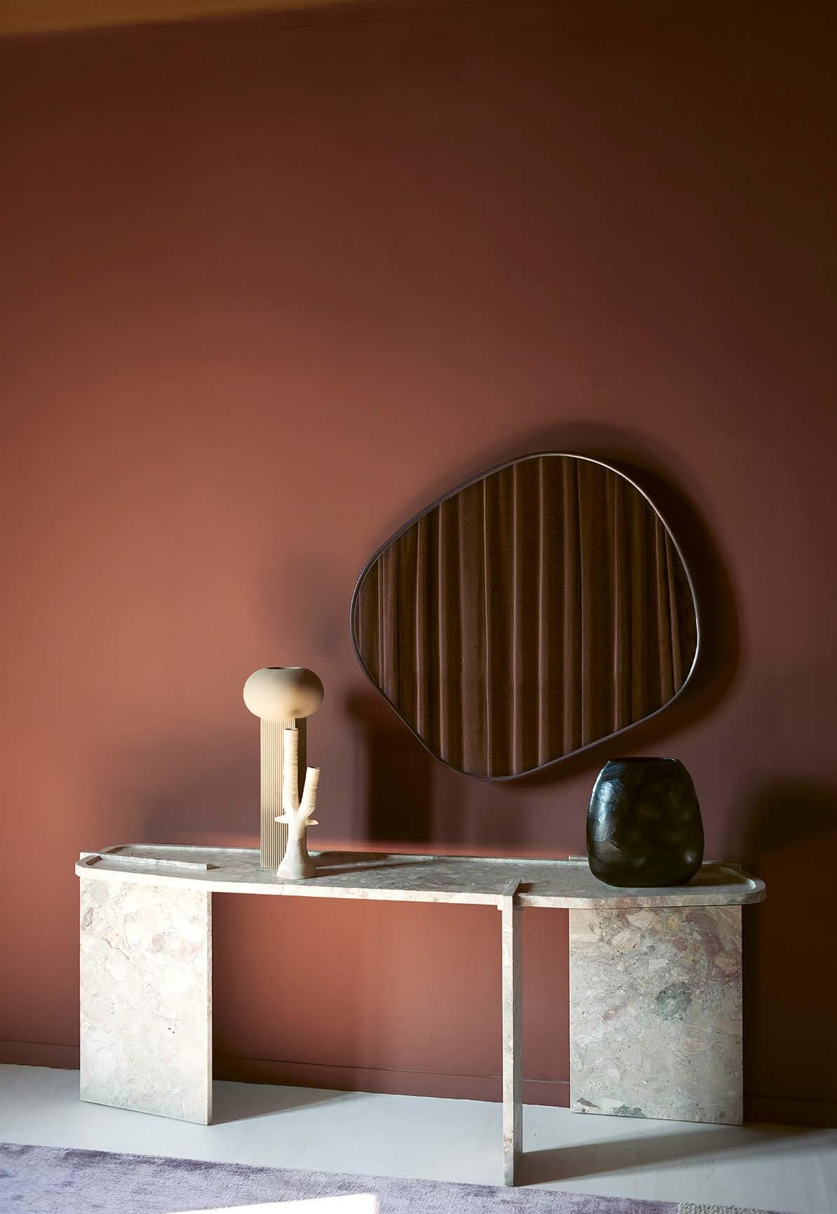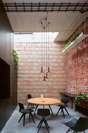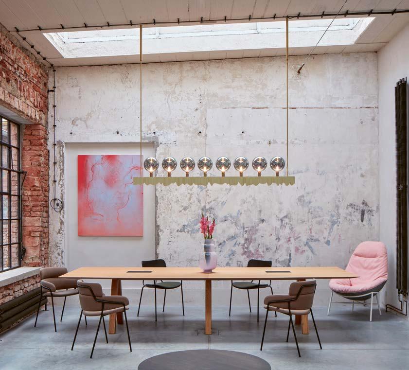 ❺ Lobby hotelu je vybaveno vintage svítidly, židlemi❶i stolem. Travertinový konferenční stolek pochází z kolekce dánské značky Ferm Living. Lavice v pozadí vznikla podle návrhu studia Nicemakers, které ji na zakázku vyrobilo v Portugalsku. Jídelní židle jsou od značky Billiani, lustry opět z produkce dánské značky 101 CPH.