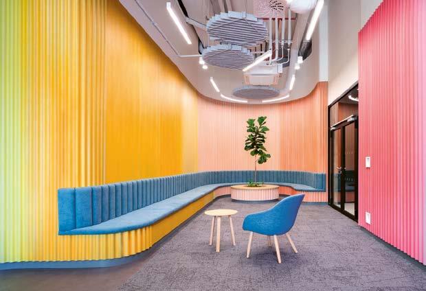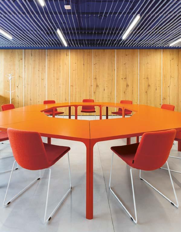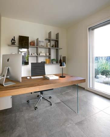 ❷ Barevnost a struktury interiérů navazují na zemité tóny hor. Nepravidelně opracované kameny pokrývají podlahu společného lounge, zatímco dřevěné podhledy a vestavný