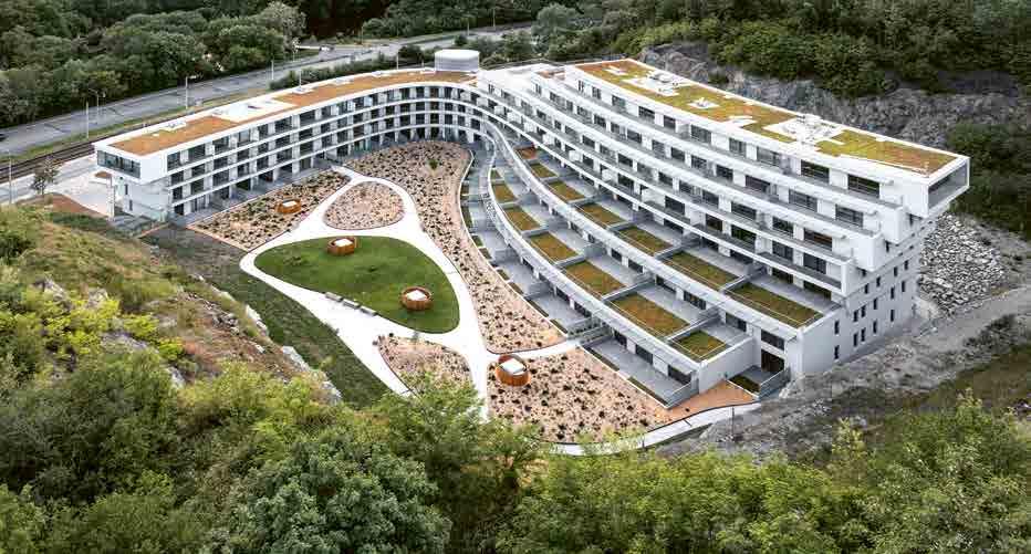 respektuje vegetaci skalních stěn, ponechává části přirozeně vzniklé zeleně a novou výsadbou podporuje druhovou pestrost. Vznikla tak přírodě blízká stanoviště pro ptáky, hmyz i drobné savce, což posiluje stabilitu místního ekosystému. Relaxační přírodní park na střeše podzemních garáží zase vytvořil ve vnitrobloku příjemné mikroklima.