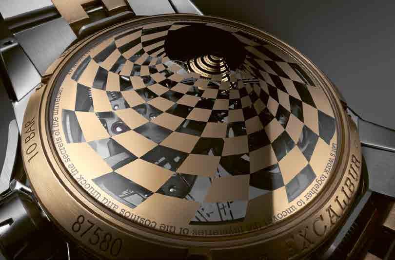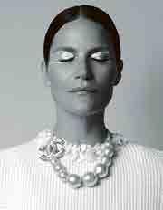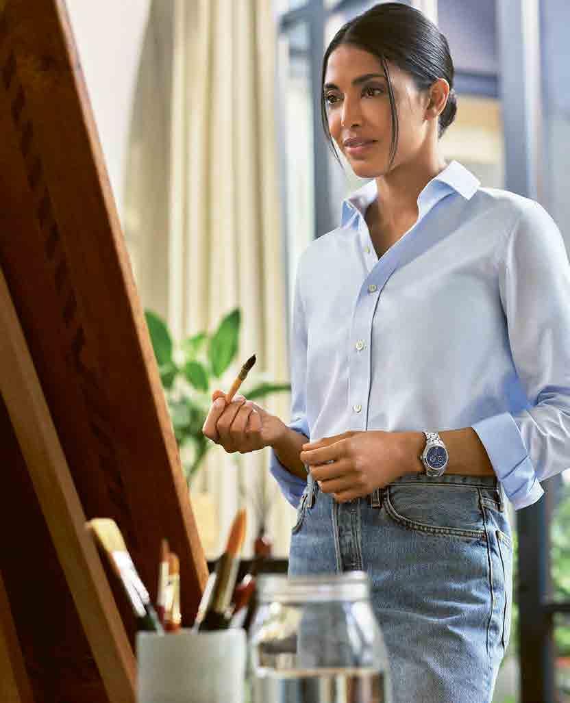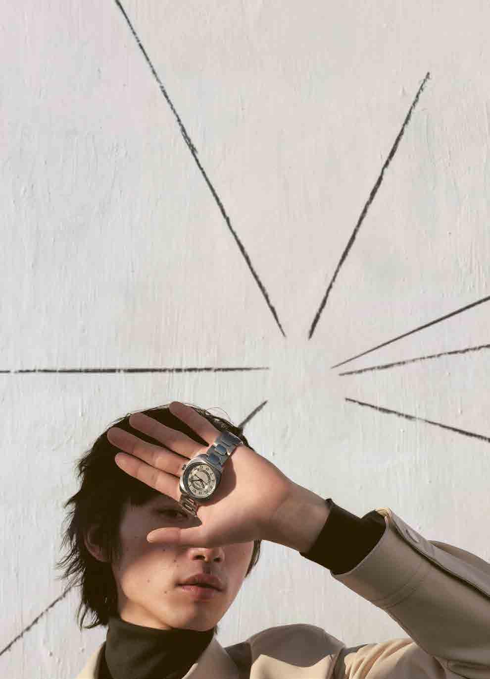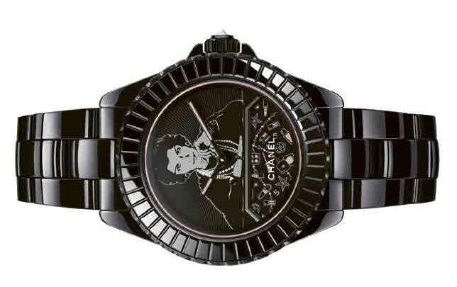 J12 BLUSH Černobílá Gabrielle Chanel sedí před svým toaletním stolkem a dívá se před sebe. Její kosmetické nezbytnosti v pudrově stříbrných a růžových tónech jsou vyskládány před ní a otáčejí se kolem ciferníku díky pohyblivému disku, který se každých pět minut posune o jednu otáčku. Tyto hodinky, oděné v černé keramice a zdobené bagetovým motivem, jsou vybaveny kalibrem 12.1, samonátahovým strojkem Manufacture. Certifikovaný chronometr COSC* je vyroben ve švýcarské manufaktuře Kenissi, jejímž je Chanel spoluvlastníkem. chanel.com