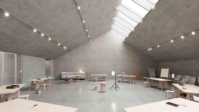 Architekti Antonín Novák, Petr Valenta a Eduard Štěrbák vklínili budovu do členitého terénu sevřeného lomem. Zatímco její přední fasáda funguje jako akustická bariéra podél silnice, dvorní část kopíruje morfologii strmých skalních stěn. Kombinaci přírodních odstínů omítek, fasády z mléčného profilového skla, plynulých křivek a dramatických zlomů doplnili autoři rozsáhlými plochami zeleně a vytvořili harmonický celek, reflektující začlenění stavby do prostředí bývalého průmyslového lomu pohlceného přírodou.