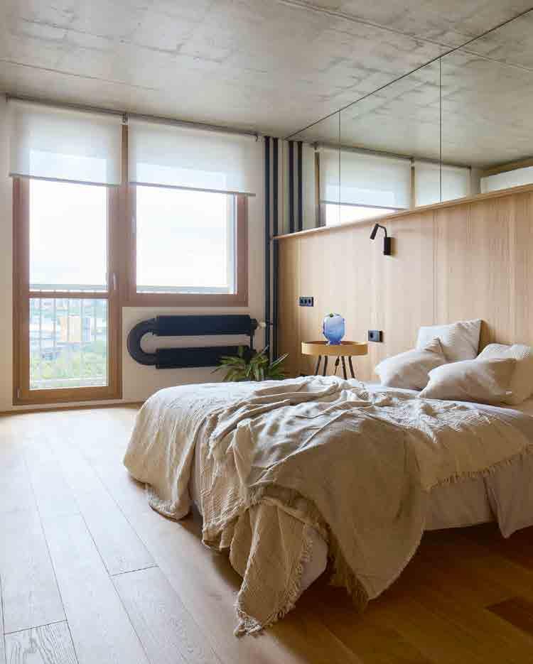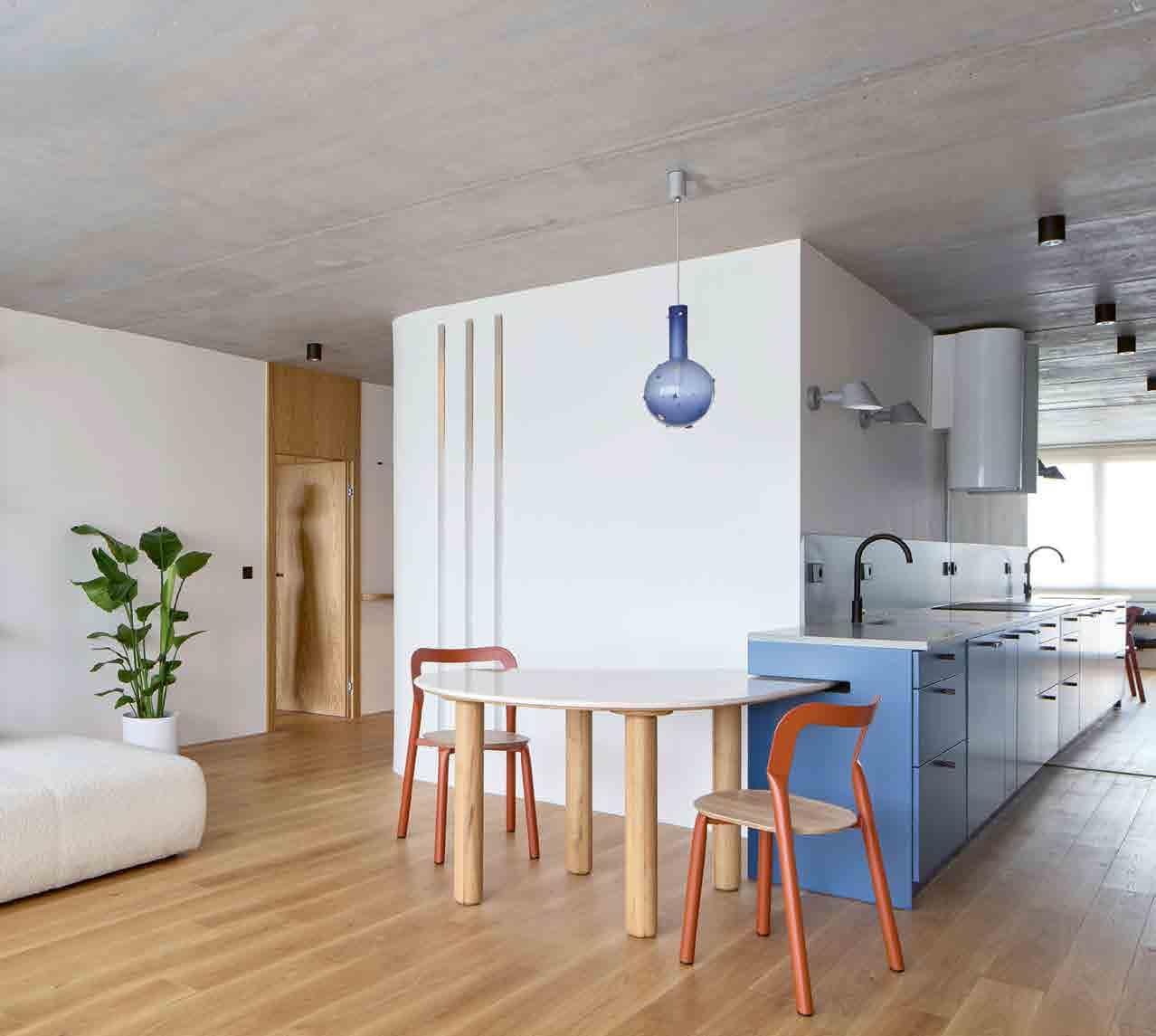 Projekt Nad obzorem architektky Ivy Hájkové proměňuje panelový byt v Praze v elegantní útočiště inspirované horizontem, mořem a pohybm. Interiér kombinuje surový beton, dřevěnou palubu, odstíny modré i hliněnou stěrku, čímž vytváří kontrastní, ale uklidňující atmosféru s minimalistickým charakterem. „Beton, který k panelovému domu patří, neskrýváme. Stěny jsme očistili od nánosů maleb a omítek a pomocí retuší je proměnili v působivé plochy surového betonu. Dřevěná prkenná podlaha je naší palubou, na níž se odehrává život. Modrá v různých odstínech, které navazují, ale nejsou stejné, je použitá na kuchyni, knihovně nebo svítidlech a vytváří dojem moře kolem nás. Hliněná stěrka v ložnici představuje dno nebo pláž, k níž připlouváme,“ popisuje architektka trochu zasněně svou realizaci. Dispozice původního 3+ kk byla změněna na velkorysé 2+ kk se samostatnou šatnou, která poskytuje samostatný úložný prostor včetně niky na cyklistické kolo s možností nabíjení. ivahajkova.cz