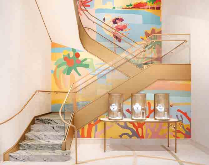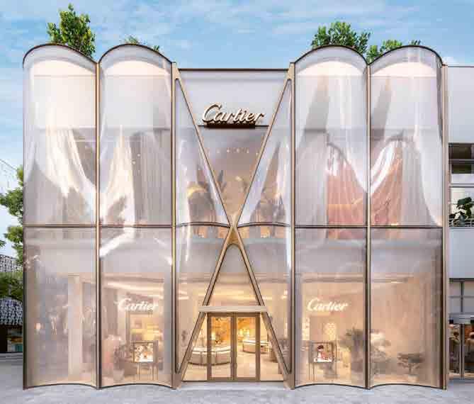 Lehce zamlžená organická fasáda nově rozšířeného butiku značky Cartier v Miami vznikla v architektonickém studiu Diller Scofidio + Renfro, které se inspirovalo podobou historické brože Cartier z roku 1909. „Obklopující fasádu jsme navrhli z vlnitého skla, které by přitahovalo kolemjdoucí a zároveň propojovalo obchod s ulicí. Na jejím povrchu je vyryt historický vzor, který vytváří průsvitný efekt a umožňuje pohled do obchodu, přičemž si zachovává jeho zamlženou mystiku,“ popisují koncept architekti. Dvě podlaží obchodu jsou z velké části otevřenými prostory, který zařídila newyorská interiérová designérka Laura Gonzalez inspirována autentickou krajinou Miami a Floridy, což v sobě odráží i barevná freska kolem schodiště.
