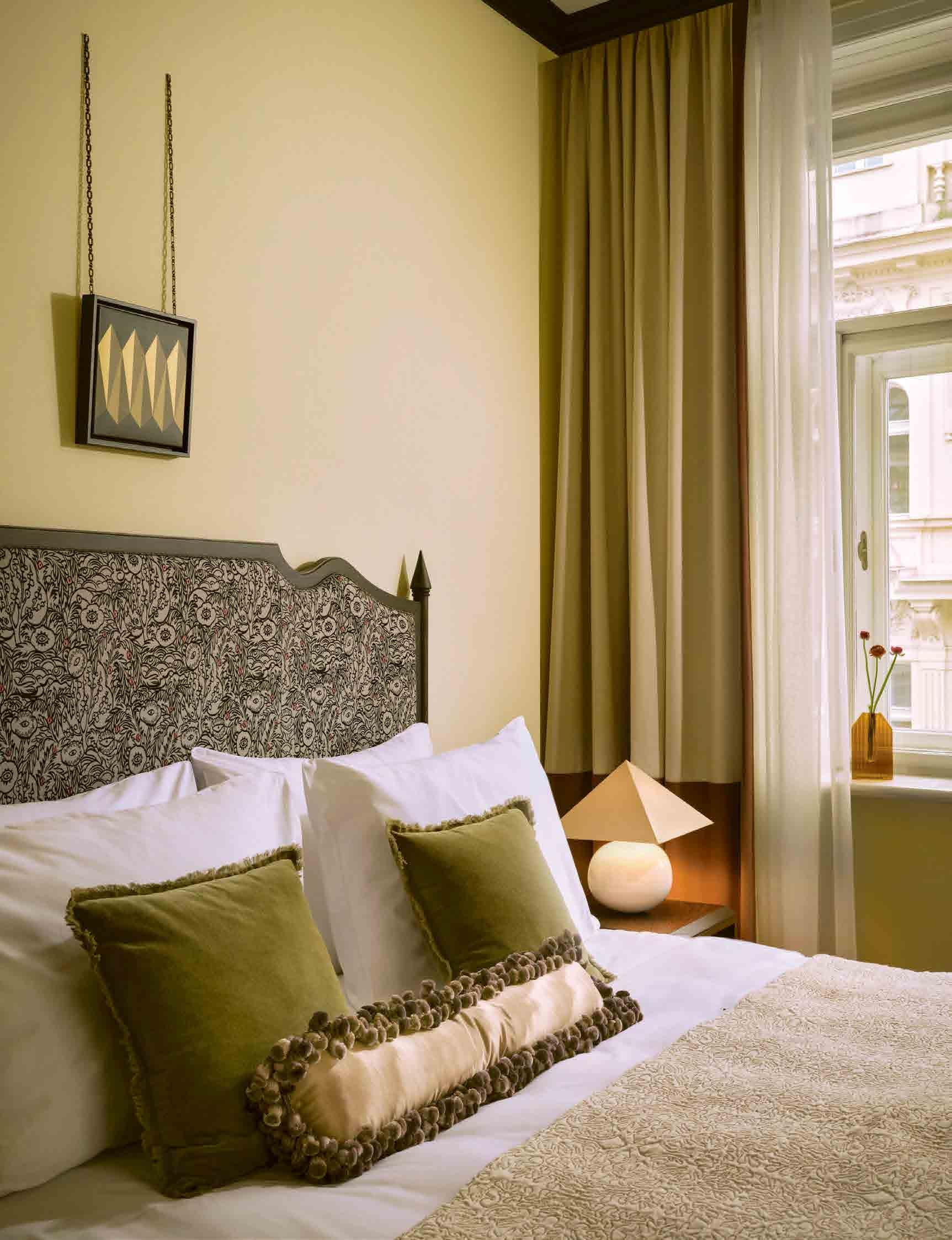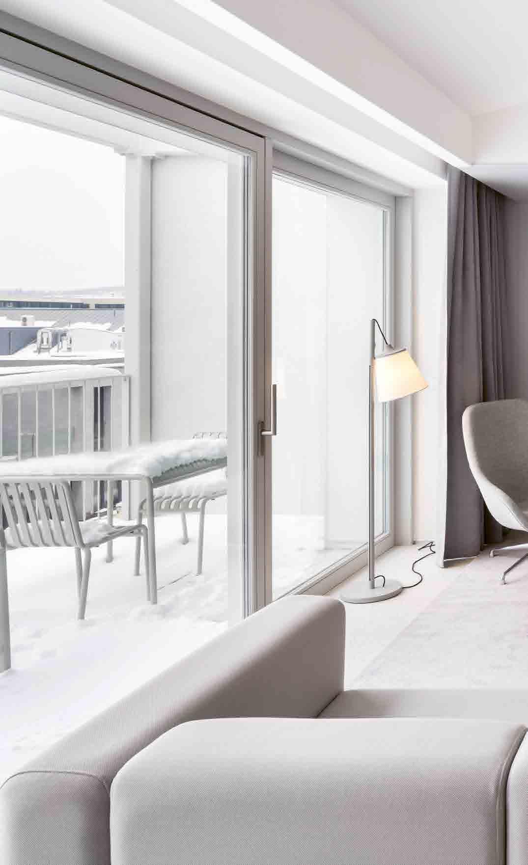 ❸ Pokoje jsou vybaveny postelemi švýcarské značky Elite a lampami Tolomeo od Artemide. Podlahy jsou z dubových parket a rámy oken z modřínového dřeva.