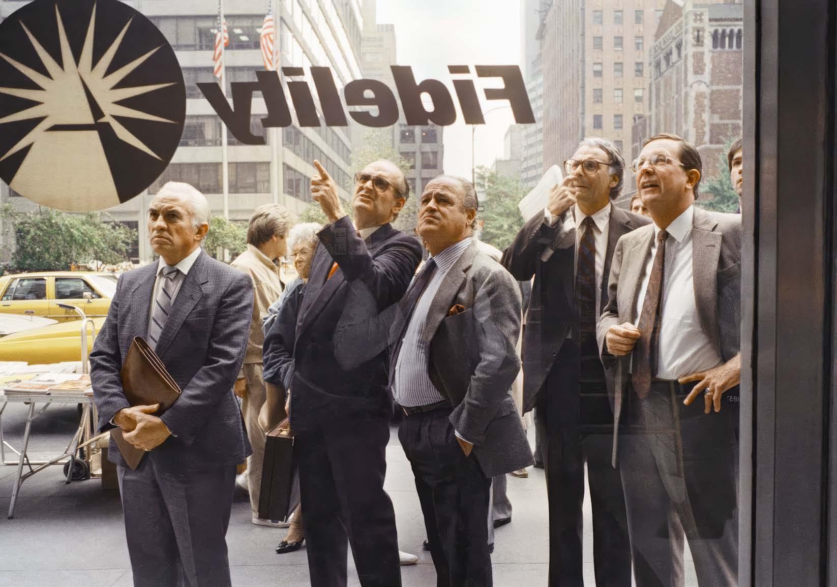 Byznysmeni komentují aktuální data z NYSE přes okno firmy Fidelity Investments v New Yorku — den po Černém pondělku.