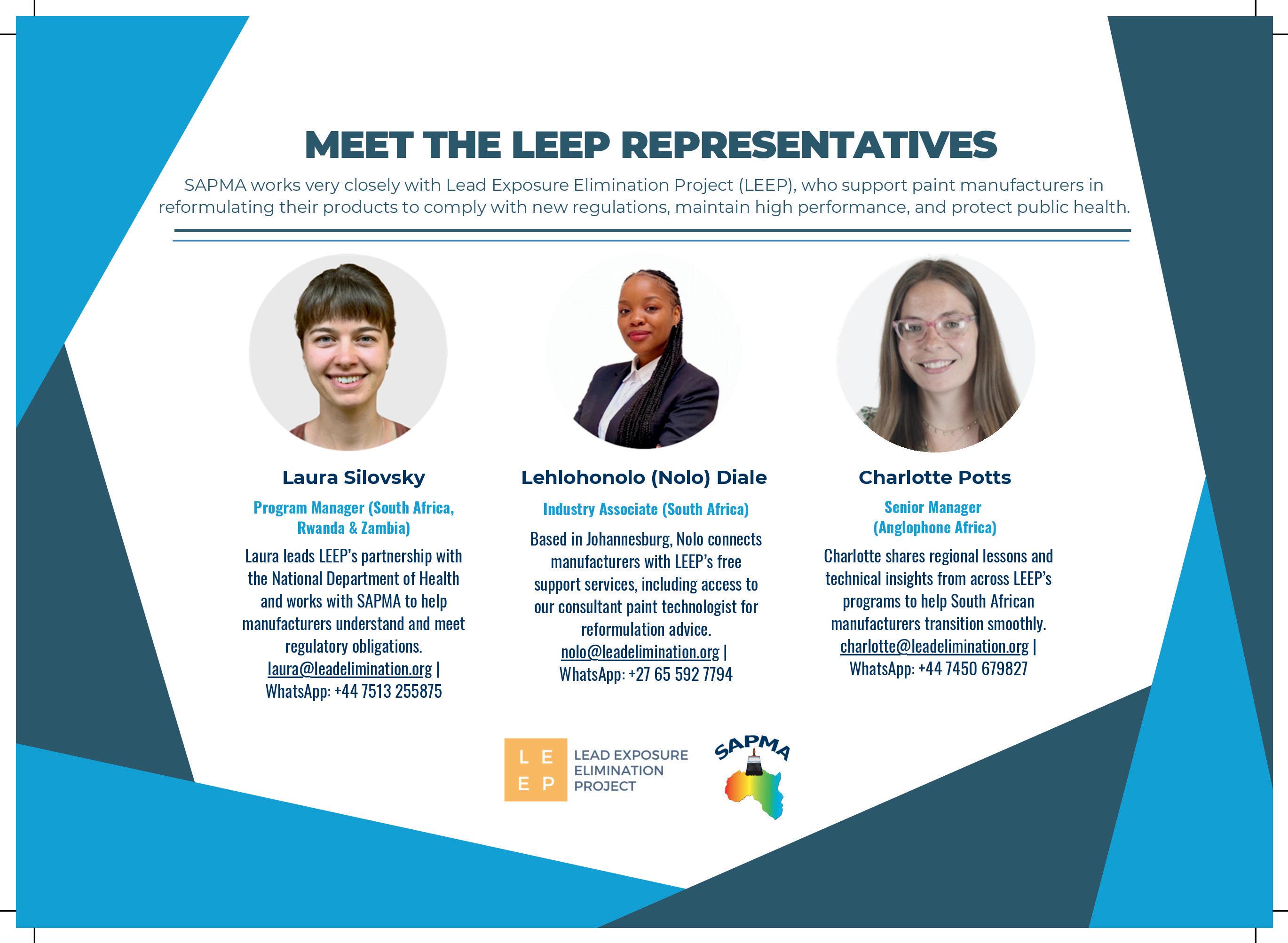 SAPMA has continued to play a pivotal role in supporting the implementation of the Lead in Paint Regulation, working closely with LEEP (Lead Elimination Project) and the Department of Health (DOH). Together, these partners have focused on the successful rollout of the regulation, ensuring members are wellinformed, compliant, and prepared for the upcoming implementation deadlines.