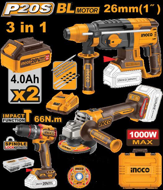 INCLUDES: Impact Drill (66Nm, 13mm metal chuck, 2-speed with LED), Rotary Hammer (2.5J, SDS Plus, 26mm concrete capacity with LED) and Angle Grinder (1000W max, 115mm disc, 3-speed settings).