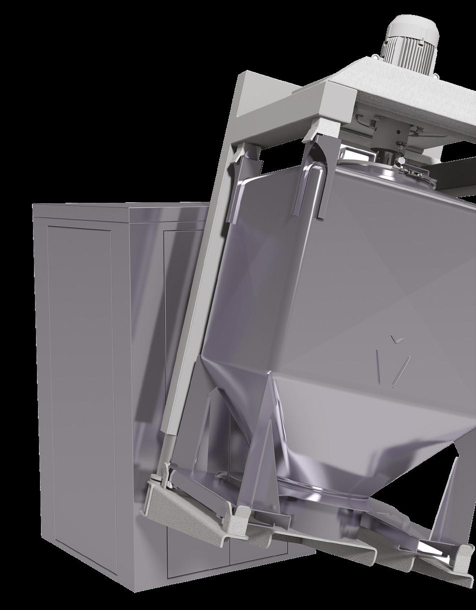 operation. It might well only take four minutes to blend, but it could take two hours to load and three hours for packing to call off. Giving a total blending time of five hours and four minutes. • In-bin/IBC Blending might take a little longer for the blend cycle (often 10 to 15 minutes), but in the long run you save time as formulation of the recipe is done off-line and the container is removed immediately from the blender and taken off to packing. The filling, mixing and packing process steps take place simultaneously. The blender itself doesn’t need cleaning so it is free to go back into service immediately. The only limiting factor is how quickly your operators can install and remove the bins from the blender.