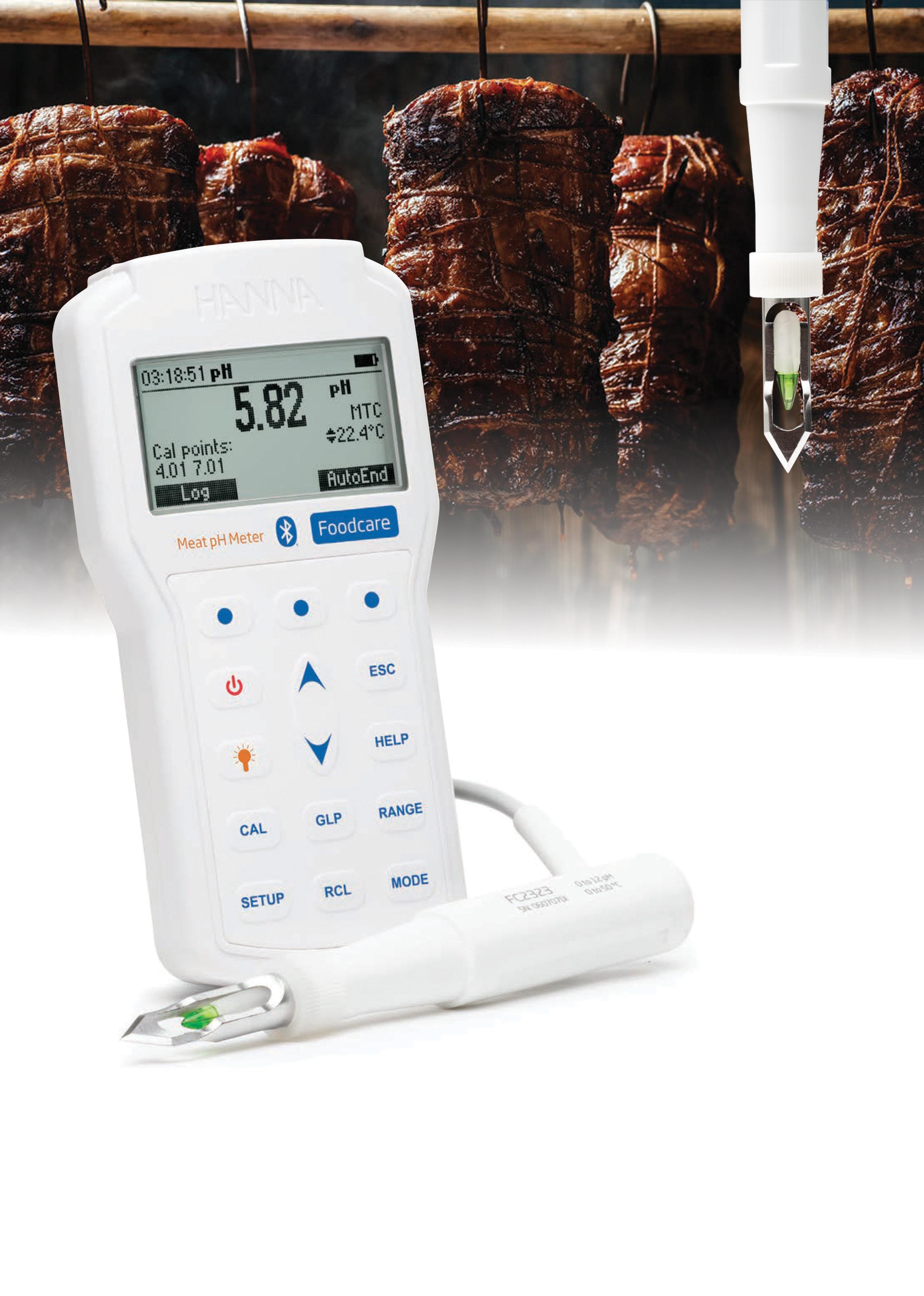 Measures pH and temperature using the foodcare FC2323 meat pH electrode (compatible with FC099 stainless steel piercing blade).