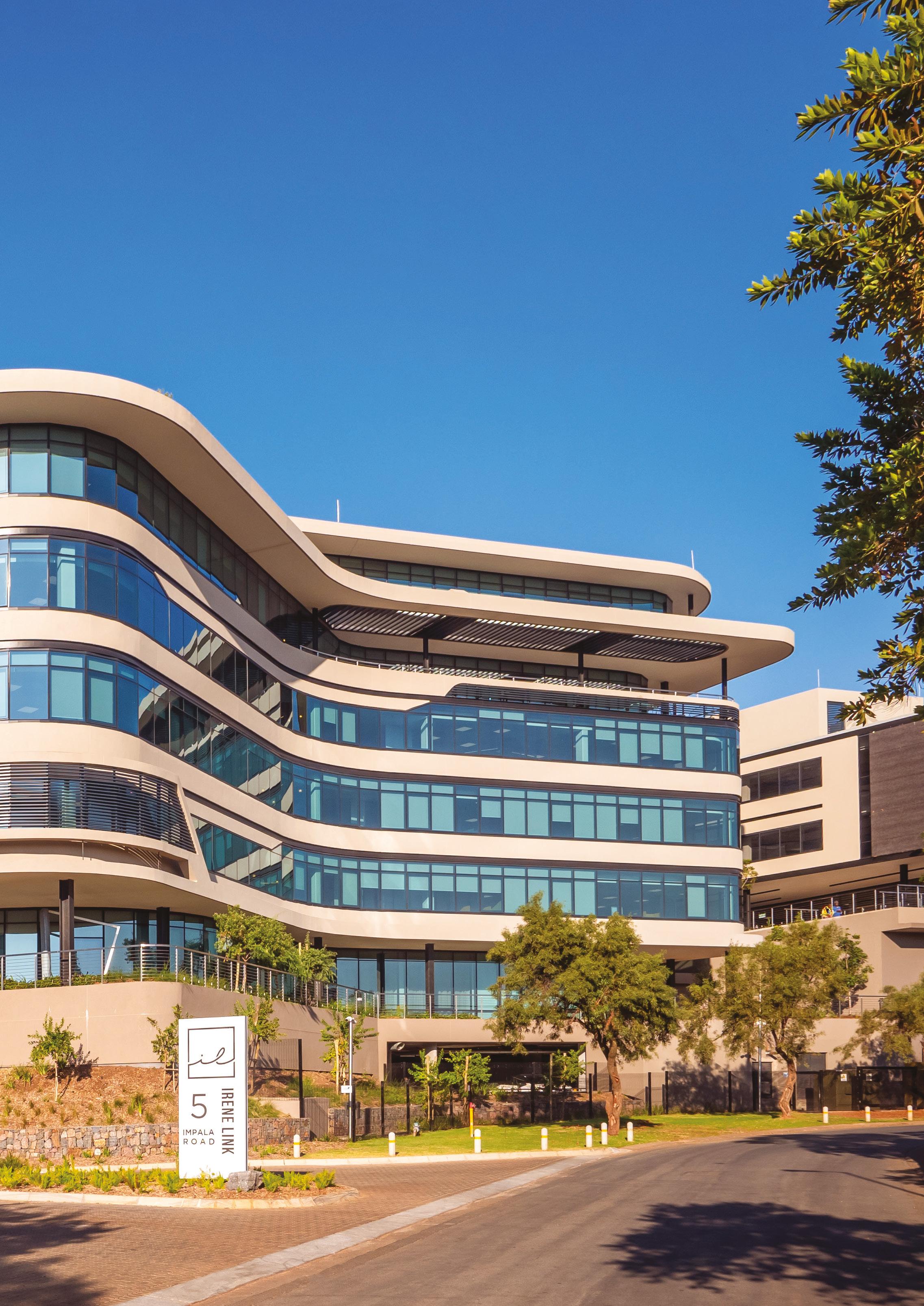 The fourth building in the Irene Link Precinct, designed by Nsika Architecture and Design, is a curvilinear head office for the AVBOB Group.