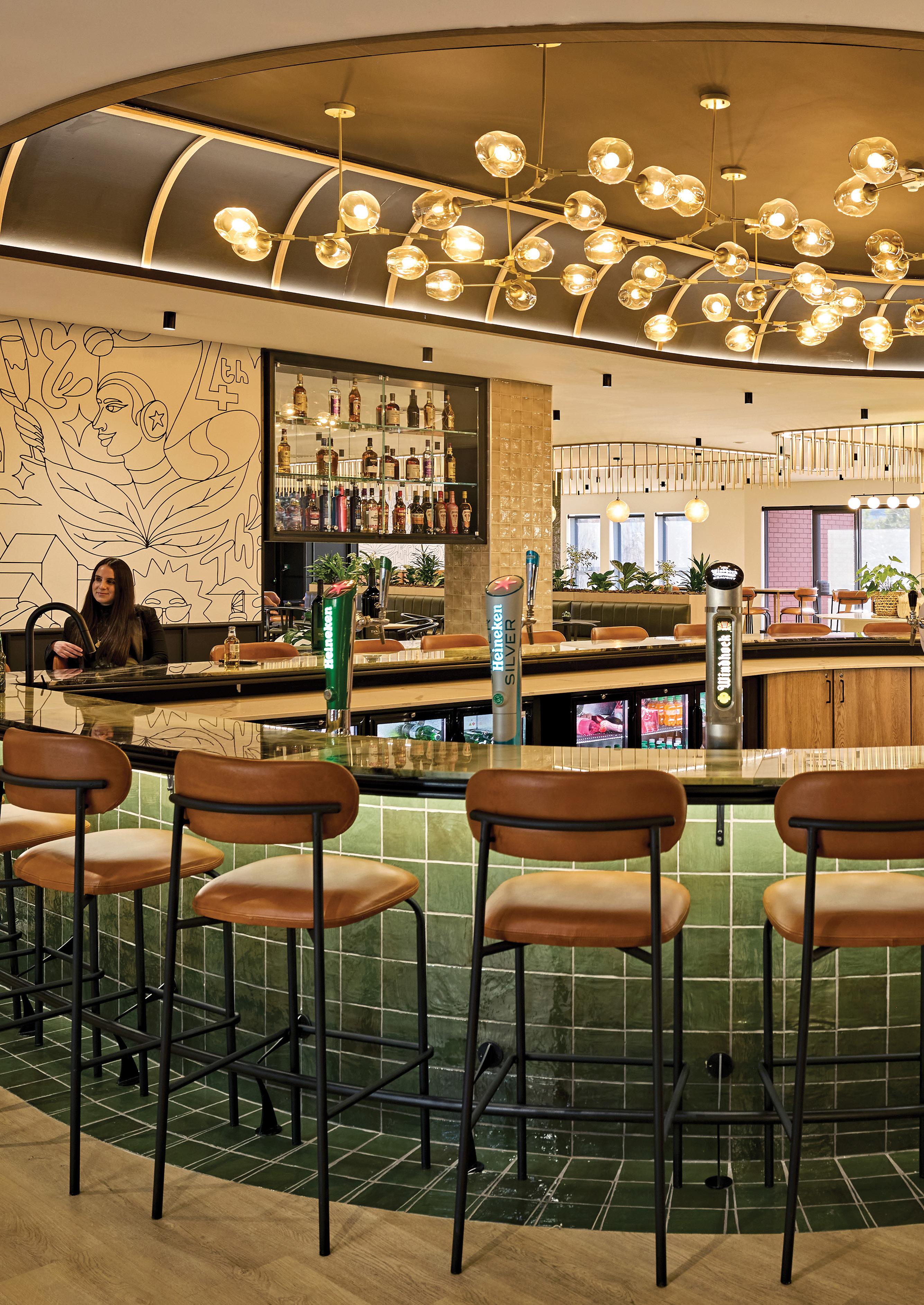 The green marble-topped bar – in the shape of the leaf logo representing Heineken’s global EverGreen strategy, another motif that makes several subtle appearances through the building – holds pride of place here. Its opulent materials and design details, including coffered ceiling and light fittings inspired by beer bubbles, exude an air of luxury and establish the premium status of the brands within the Heineken stable.