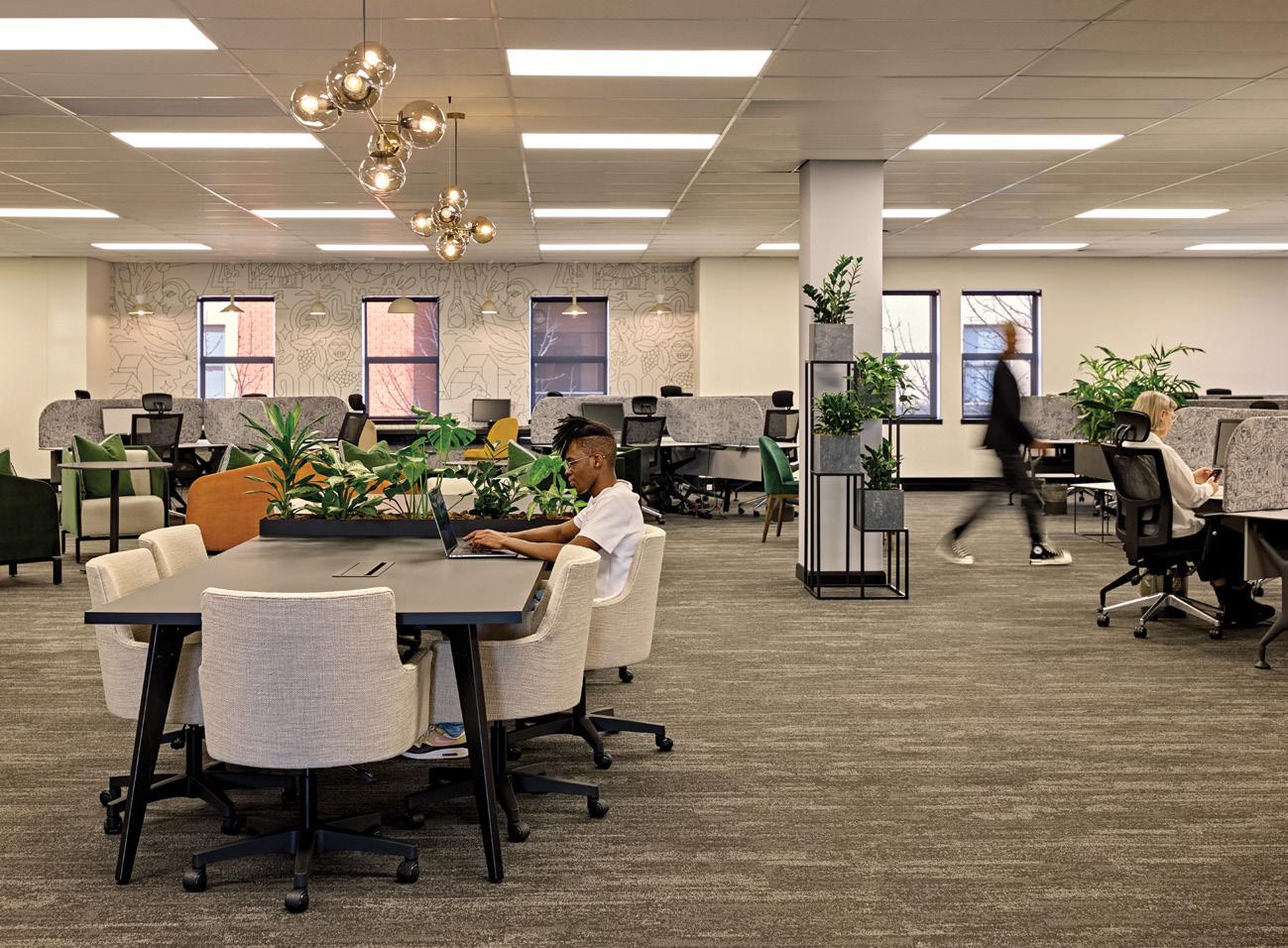 The variety encourages movement, interaction, and the exchange of perspectives and ideas. In addition to workstations, the open-plan office space offers booths, tables, lounge areas and huddle rooms to support fast and seamless transitions between activities and work modes, supporting group activities, focused work, remote communications, and any other function the modern workplace might demand.